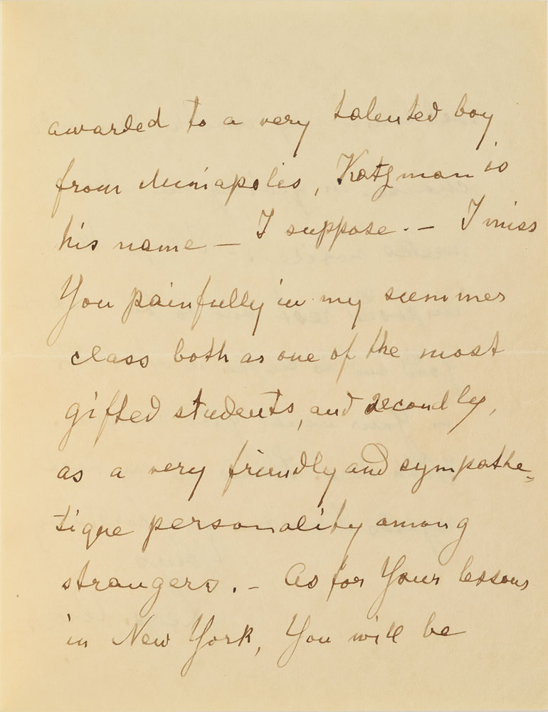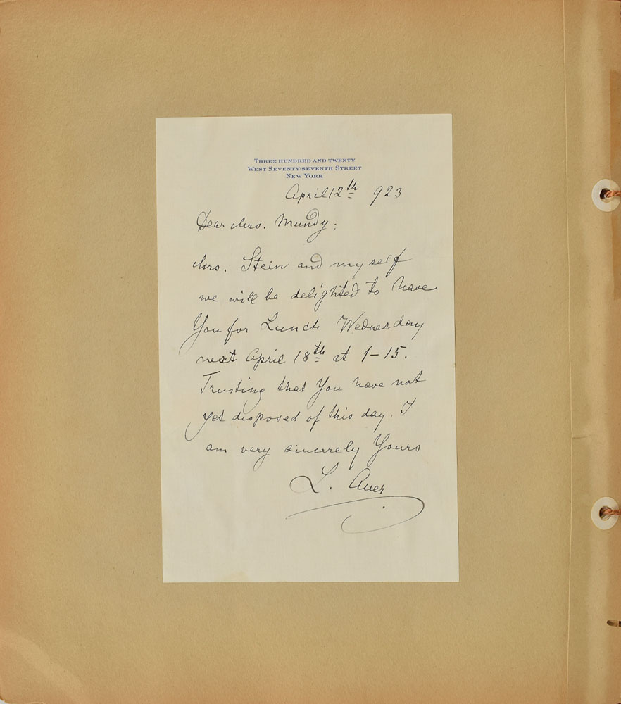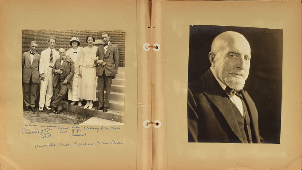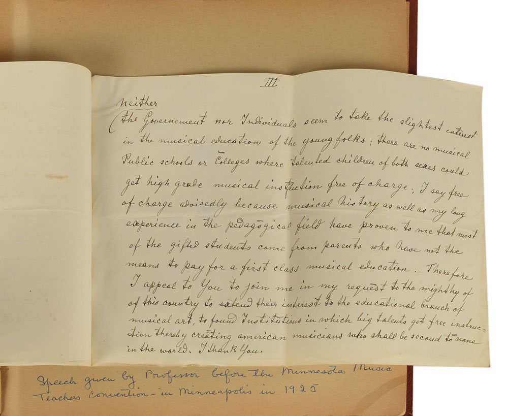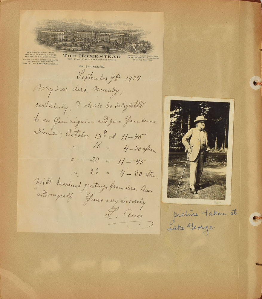 Hungarian violinist, conductor, and composer (1845-1930) who was renowned as a violin teacher; among his top students were Jascha Heifetz, Nathan Milstein, and Mischa Elman. Scrapbook compiled by one of Auer's students, containing a signed photo, four ALSs, one LS, a TLS, two signed Christmas cards, and a handwritten speech, as well as a variety of unsigned newspaper clippings, program pages, and original photographs affixed within. Highlights of the scrapbook include: a glossy 8 x 10 Underwood & Underwood photo of Auer holding his violin in a three-quarter-length pose, signed in fountain pen, "L. Auer, 1924"; two Christmas cards signed by Auer, "L. Auer," and one signed by his wife Wanda, "Wanda and Leopold Auer"; a 1923 ALS signed "Leopold Auer," in part: "I am keenly interested in the meeting of your association at Saint Paul; this will be my maidenly appearance as a teacher before such a numerous assembly of specialists"; a 1923 ALS signed "Leop. Auer," in part: "I am delighted to learn…that you as well as the teachers were satisfied with my first demonstration class. I am proud of my success in this new field for me…I miss you painfully in my summer class both as one of the most gifted students, and secondly, as a friendly and sympathetique personality among strangers"; a 1923 ALS signed "L. Auer," accepting a lunch invitation; a 1923 LS signed "Leop. Auer," concerning arrangements for his demonstration lessons; a 1924 ALS signed "L. Auer," sending his schedule; a three-page handwritten speech by Auer, given before the Minnesota Music Teachers Convention, beginning: "I am proud of having the privilege upon this occasion and under such enviable auspices to be associated with a body of musicians of noted excellency; in fact it is the first time in my career that I meet an assembly of specialists representing the best violin-teaching element in this section of the United States"; and a 1927 TLS signed "Prof. L. Auer," recommending his correspondent, in part: "Mme. Lota Mundy has been my pupil for several seasons. Her familiarity with my method of teaching enables her to impart instructions in full accordance with it. She also excels as an artistic and musicianly concert soloist." Also affixed within the scrapbook are two additional letters by his wife Wanda Bogutska Stein (one showing the front only), as well as a printed announcement of their 1924 wedding. Two of the letters, a photo, and some programs are loosely laid in and not affixed to the scrapbook pages. In very good to fine condition.