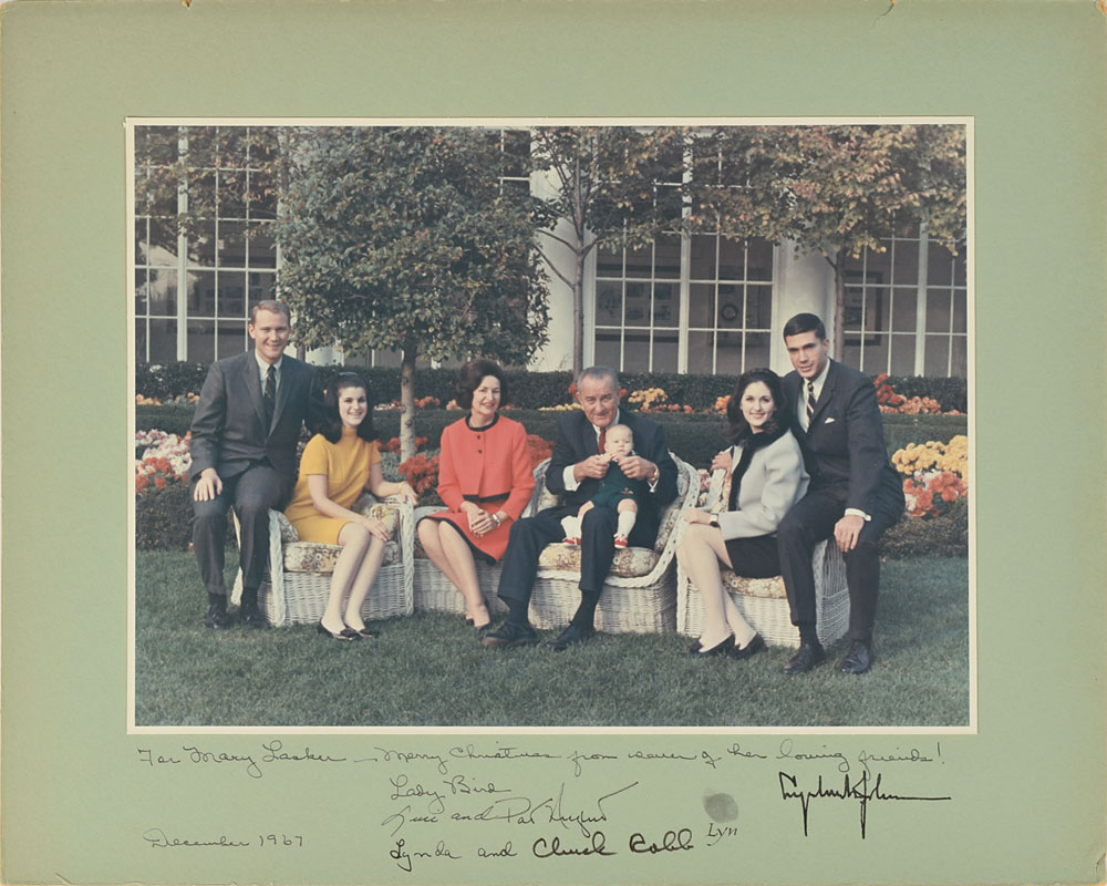 Scarce color glossy 11.5 x 8.25 photo of the Johnson family posing on the White House lawn, showing Luci Johnson and husband Pat Nugent, the president and first lady with new grandson Patrick, and Lynda Johnson and her husband Chuck Robb, affixed to the original 15 x 12 mount, signed and inscribed on the mount in black ink or felt tip, "For Mary Lasker—Merry Christmas from some of her loving friends! Lady Bird, December 1967," "Lyndon B. Johnson," "Luci and," "Pat Nugent," "Lynda and," and "Chuck Robb," with the Nugents adding the fingerprint of their infant son, Patrick Lyndon. In fine condition, with some small edge dings and a short tear to the top edge, all easily matted out. Lasker was an American health activist and philanthropist, who worked to raise funds for medical research and founded the Lasker Foundation. She helped convince Eleanor Roosevelt to endorse Lyndon Johnson's efforts to become the 1960 Democratic nominee, and Lady Bird glowingly mentions Lasker in her book A White House Diary. Lasker was the recipient of the Presidential Medal of Freedom in 1969.