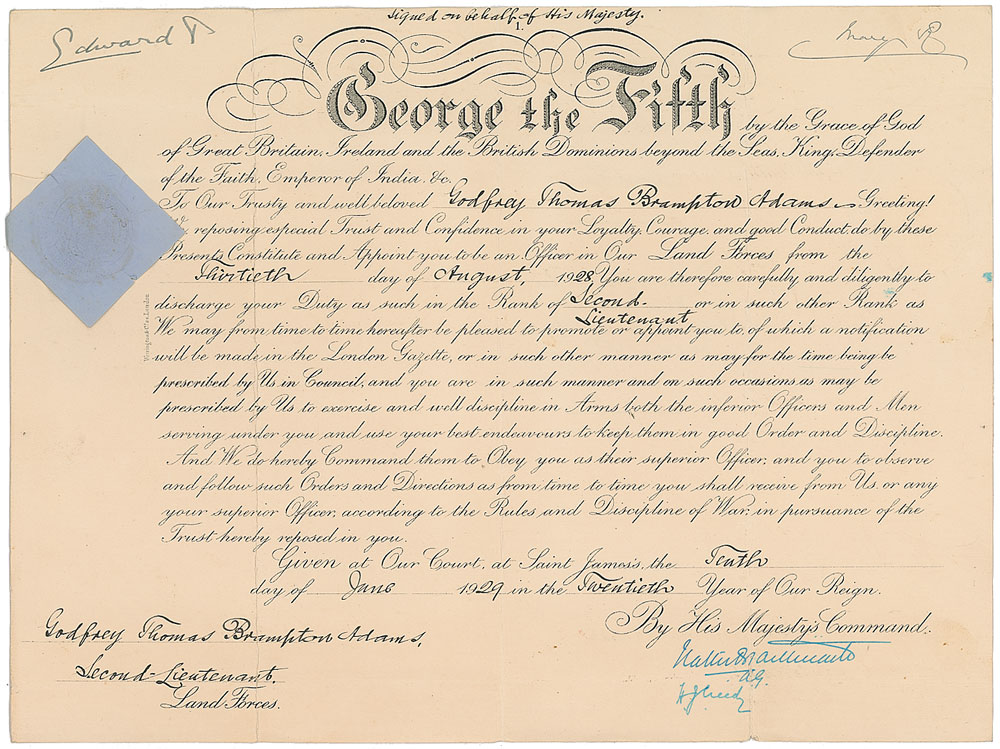 Partly-printed DS, signed by Edward as prince, “Edward P,” and Queen Mary, "Mary R," one page, 16 x 12, June 10, 1929. On behalf of His Majesty George V, Prince Edward appoints Godfrey Thomas Brampton Adams "to be an Officer in Our Land Forces…in the Rank of Second-Lieutenant." Signed at the head by Edward VIII and Queen Mary. Countersigned at the foot by Walter Braithwaite and Herbert J. Creedy. The blue paper seal affixed to the upper left remains fully intact. In very good to fine condition, with areas of creasing and three heavy vertical folds. King George V suffered a serious, life threatening illness during 1929 and spent three months of the year convalescing in Bognor, West Sussex, following which he bestowed the Royal Regis suffix to the town.