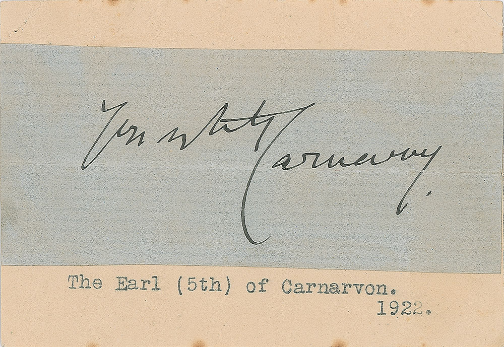 English aristocrat (1866-1923) and amateur Egyptologist best known as the financier of Howard Carter's excavation of Tutankhamun's tomb. Ink signature, "Yours truly, Carnarvon,” on an off-white 3.5 x 1.5 slip affixed to a slightly larger card. In fine condition, with a light central horizontal fold.