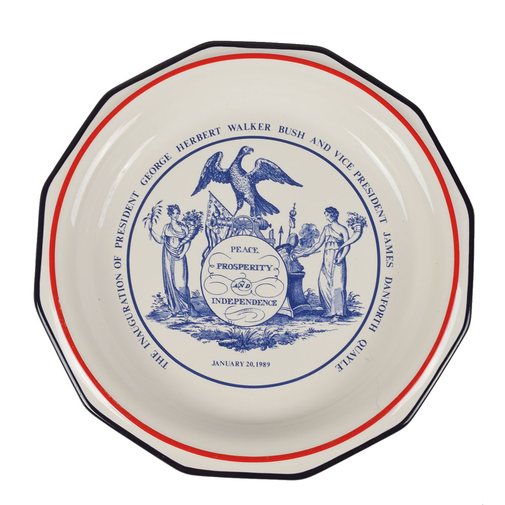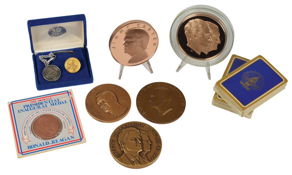 Group of ten presidential inauguration medals and gift items representing seven chief executives, including: a 2.75″ bronze medal honoring the 1953 inauguration of Dwight D. Eisenhower; a 2.5″ 'Peace and Prosperity' bronze medal honoring the 1965 inauguration of Lyndon B. Johnson, in its original box; a 2.75″ bronze proof medal honoring Richard Nixon's 1973 inauguration, in its original case and box; a 2.75″ bronze proof medal honoring Jimmy Carter's 1977 inauguration, in its original box; a 1.5″ copper medal honoring Ronald Reagan's 1981 inauguration, in its cardboard holder; a 1″ gold-tone blazer button and 1″ silver-tone charm honoring Reagan's 1985 inauguration, in a blue velvet box; a 6.75″ Mottahedeh ceramic bowl honoring George Bush's 1989 inauguration; a 2.75″ bronze medal honoring Bill Clinton's 1997 inauguration, in its original box; and two sealed decks of playing cards honoring Clinton's 1997 inauguration, in their original box. In overall fine condition.