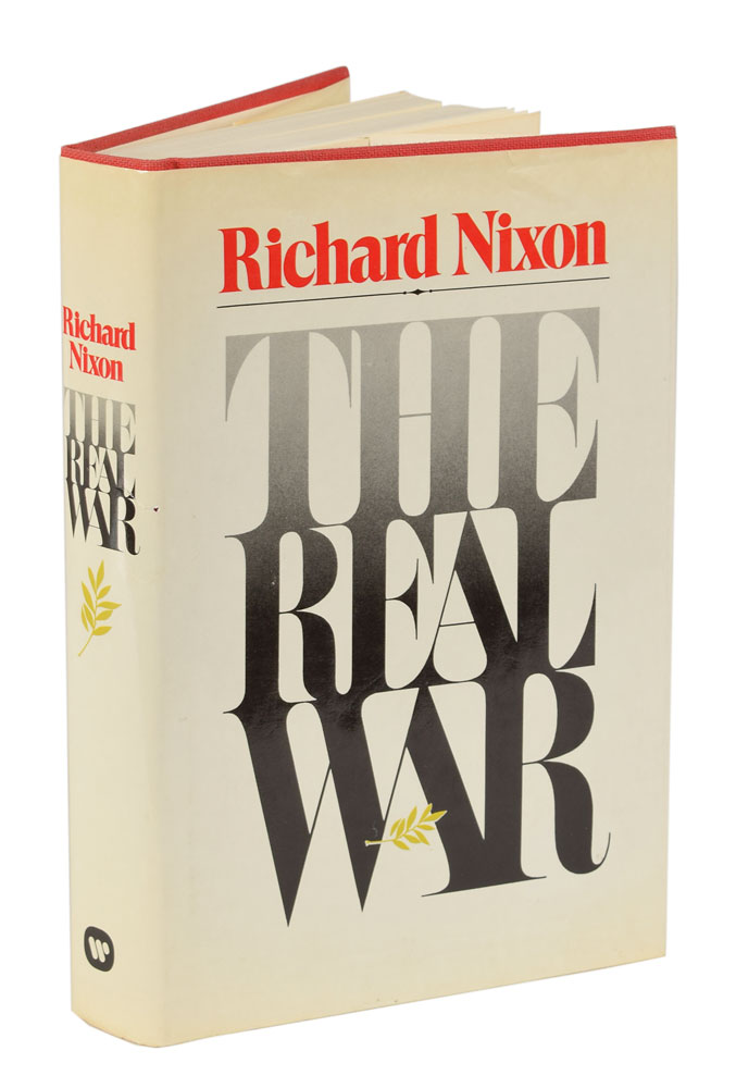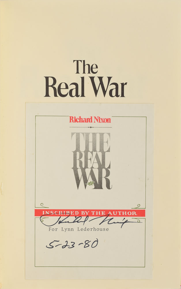 Signed book: The Real War. First edition. NY: Warner Books, 1980. Hardcover, 6.5 x 9.25, 341 pages. Signed on a special bookplate affixed to the half-title page in thin black felt tip, "Richard Nixon, 5-23-80," which also bears a typed inscription. In fine condition, with some light creasing to the dust jacket.
