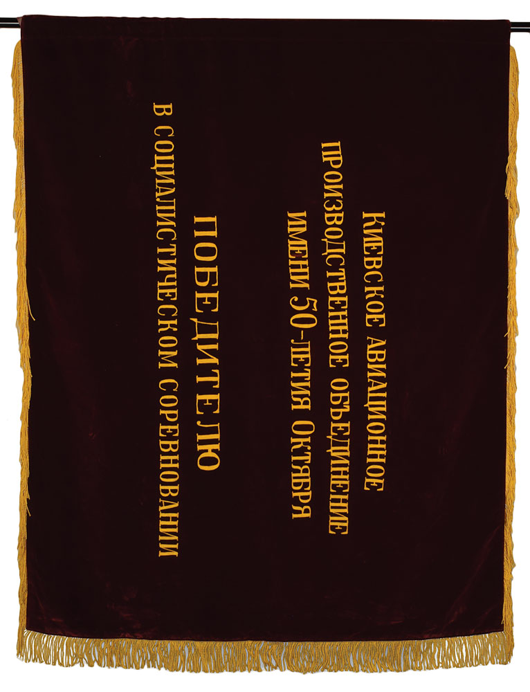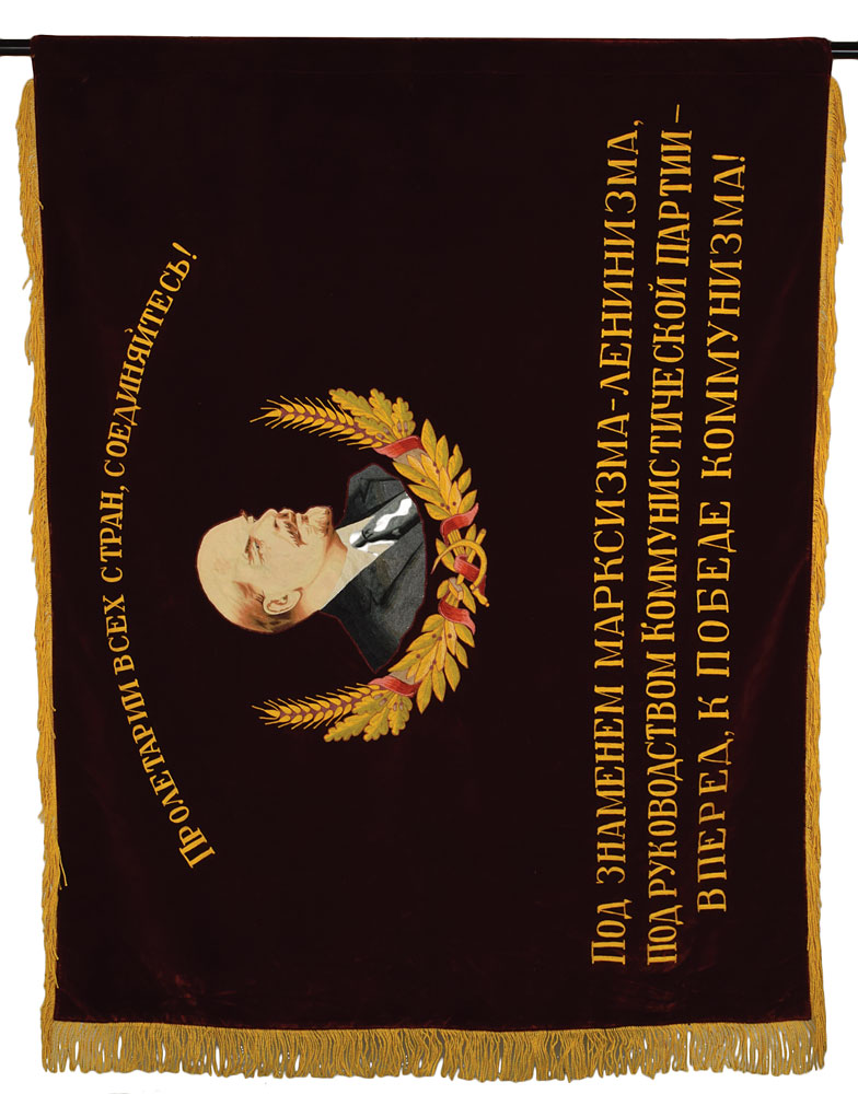 Impressive Cold War-era Soviet banner from an airplane parts manufacturing plant, celebrating the 50th anniversary of the October Revolution, measuring 66″ x 51″, with 3.5″ yellow-gold fringe on three edges. The two-sided deep maroon velvet flag features an intricately embroidered profile of Lenin, made exceptionally lifelike by the use of many shades of fine thread. Golden embroidered Cyrillic text reads (translated): "Proletariat of all nations, unite!" and "In the name of Marxism-Leninism under the direction of the Communist Party—Forward, to the victory of Communism!" The reverse side is dedicated to the "Kievan Aviation Manufacturing Union, in the name of the 50-year anniversary of the October Revolution. To the victor in Socialist competition." In fine condition. Of the finest quality workmanship, this flag would have been awarded to the winner of a Socialist competition held by the aircraft parts factory. Such banners were a highly visible symbol of honor and pride for employees in state-run enterprises before the collapse of the Soviet Union.