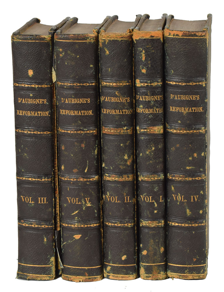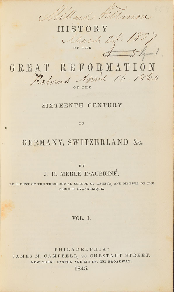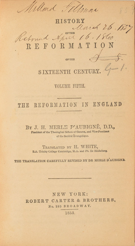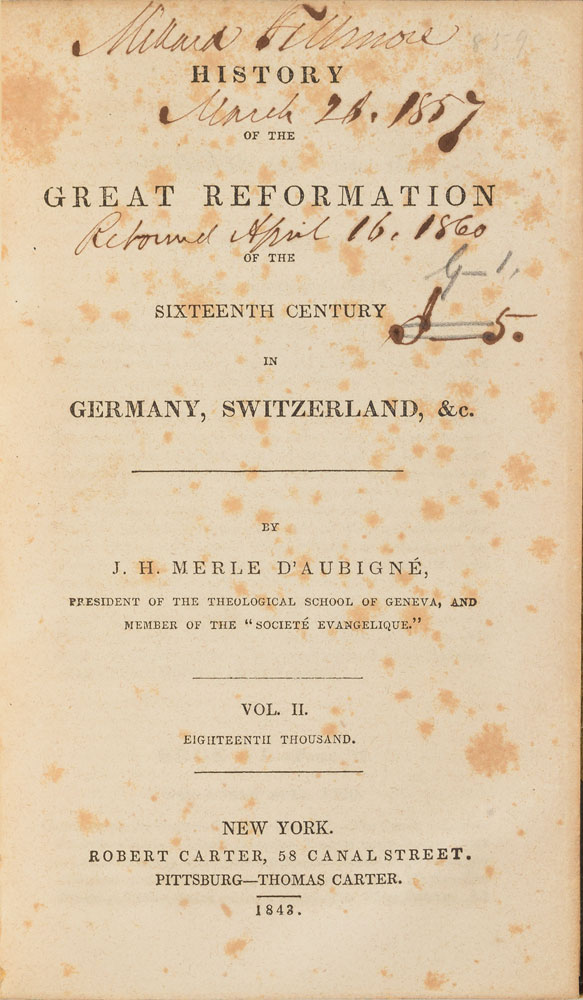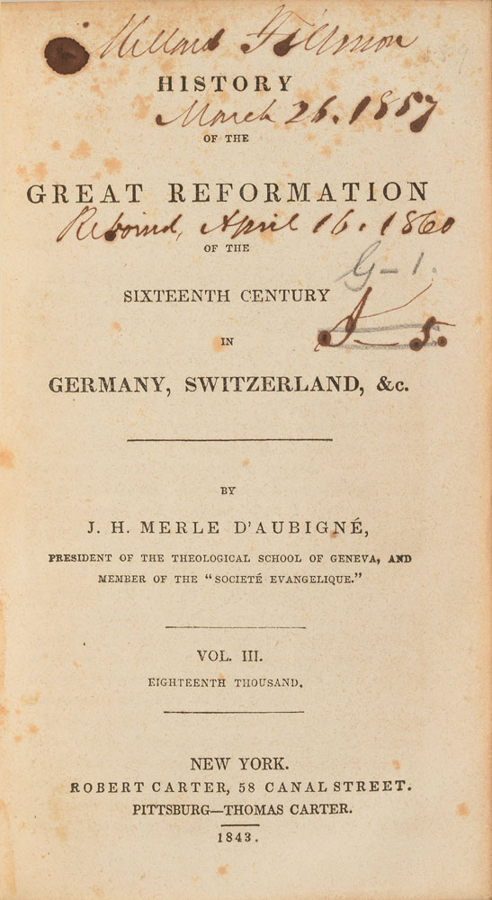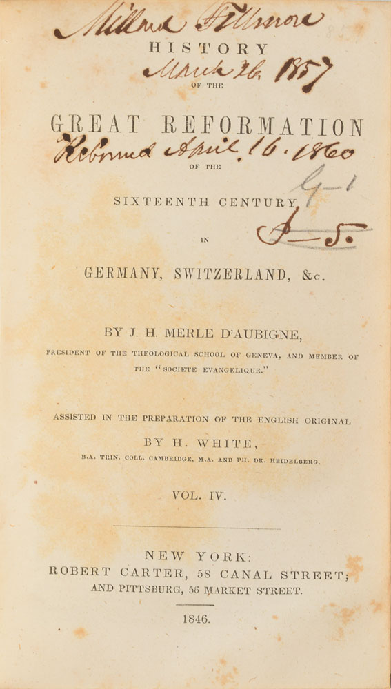 Signed books from Millard Fillmore's personal library: History of the Great Reformation of the Sixteenth Century in Germany, Switzerland, &c. by J. H. Merle D'Aubigne, Volumes I-V. Published in New York by Robert Carter & Brothers, 1843-1853. Signed on the title page of each volume in ink, "Millard Fillmore, March 26, 1857, Rebound April 16, 1860, J-5." In pencil, Fillmore has crossed out the "J-5" bookshelf designation, replacing it with "G-1." Autographic condition: very good to fine, with some scattered staining and foxing to title pages. Book condition: G/None, with edgewear, staining to boards, rubbing to spines, and general wear; the front hinge of Volume V is cracked and fragile, and the front board of Volume III is completely detached, and at one time was crudely repaired with tape (remnants of which remain). Fillmore had each book attractively rebound in black morocco over olive green boards, spines in compartments with four raised tooled bands, lettered in gilt “D’Aubigne’s / Reformation” and volume number in Roman numerals in two compartments.