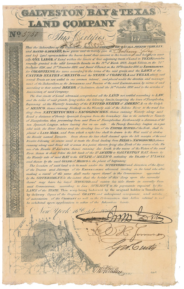 Attractive DS, one page, 8 x 12.75, October 16, 1830. A real estate document from the Galveston Bay and Texas Land Company, issued as certificate No. 5750, which certifies that "the Subscribers as the Trustees and Attorneys of Lorenzo de Zavala, Joseph Vehlein, and David G. Burnet, have given and hereby give to Anthony Dey…One Labor of Land within the limits of four adjoining tracts of Land in Texas." Boldly signed at the conclusion by company officers Anthony Dey (who signs again on the reverse), William H. Sumner, George W. Curtis, and W. H. Willson as secretary. In fine condition, with thin paper along the extreme right edge.