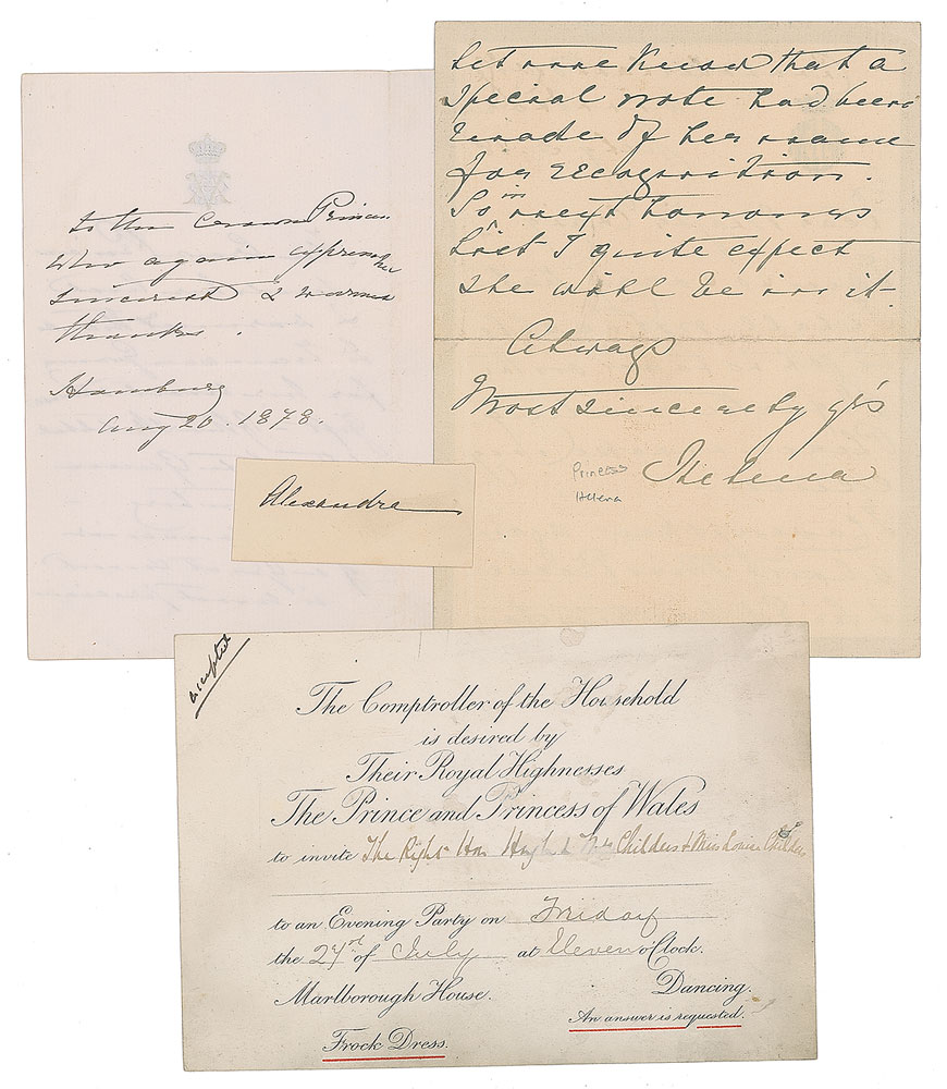 Three items signed by British princesses: a third-person ALS by Victoria, Princess Royal, signed within the text, "The Crown Princess," one page both sides, 1878; an ALS by Princess Helena, signed "Helena," one page both sides, 1918; and an ink signature by Princess Alexandra, "Alexandra," on an off-white slip. Also includes an invitation to an evening party hosted by the Prince and Princess of Wales on July 27, [no year]. In overall fine condition.