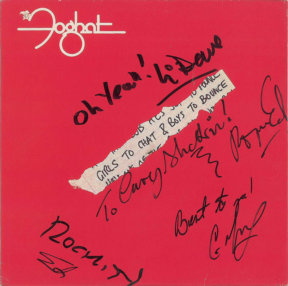 Girls to Chat & Boys to Bounce album signed on the front cover in black felt tip, "Oh yeah! Lo Dave [Peverett]," "Rockin, Erik [Cartwright]," "Best to you! Craig MacGregor," and "Roger Earl," who adds an inscription. In fine condition, with a reduction hole in the upper left corner. The record is included.