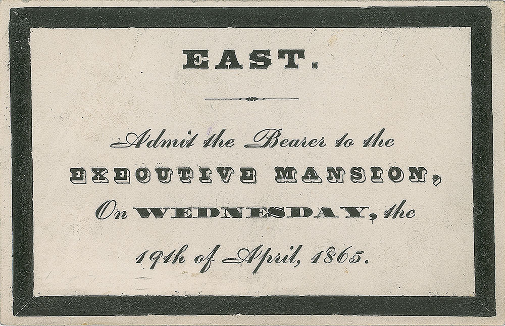Rare pass to the White House funeral for the fallen President Abraham Lincoln, printed on a heavy white 5 x 3.25 card with black mourning border, reading: "East. Admit the Bearer to the Executive Mansion, On Wednesday, the 19th of April, 1865." In fine condition. The funeral service took place in the East Room of the White House, with the Lincolns' pastor, Dr. Gurley, giving the funeral address and Bishop Simpson, who would later deliver the funeral address in Springfield, offering a prayer. A scarce and sought-after funeral memento.