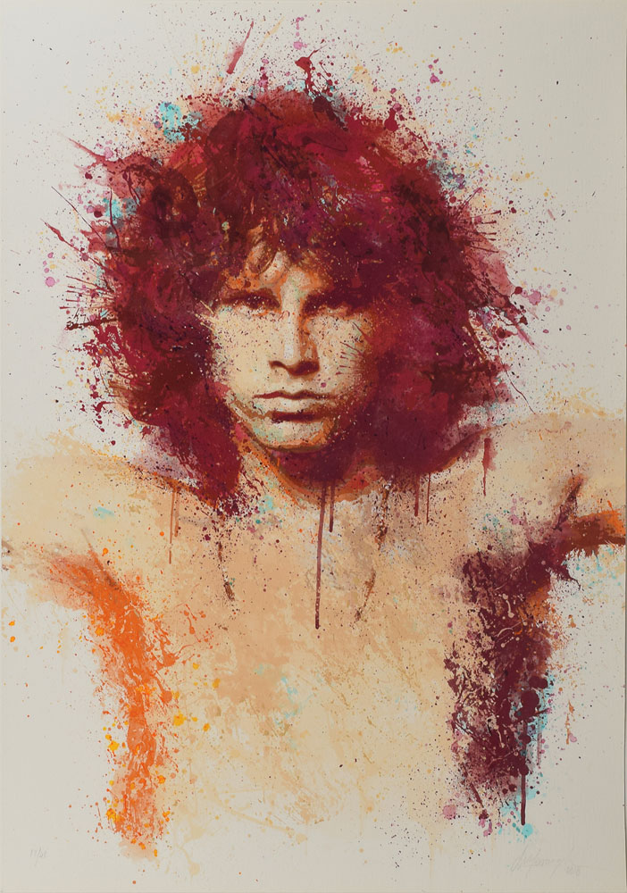 Gorgeous color limited edition 23.25 x 33 hand-finished giclee print by Daniel Mernagh portraying Jim Morrison, numbered 12/40, signed in the lower right in pencil by the artist, "D. Mernagh, 2016." The vibrant artwork, accomplished in Mernagh's distinctive drip-splash style, depicts the Doors frontman in a classic shirtless pose. The print is executed on Hahnemuhle German Etching fine art paper. In fine condition. A London-based contemporary artist, Daniel Mernagh casts celebrities and icons in a bold, bright, and unique style of work; in 2015, he curated his first show at London's Fabric nightclub.