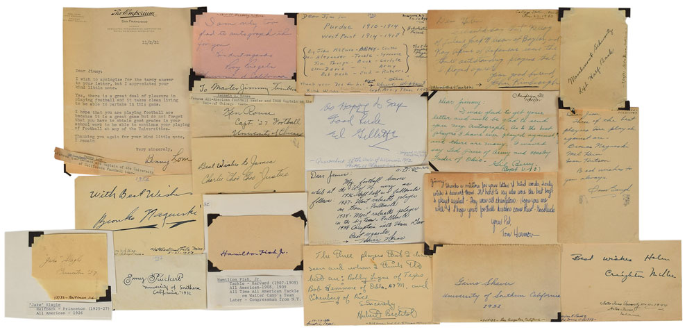 Collection of 21 items signed by early stars of the gridiron, consisting mostly of signatures or ANSs on slips or cards, with football players including (some inscribed): Sammy Baugh, Hub Bechtol, Gil Berry, Hamilton Fish, Jr., Eddie Gillette, Tom Harmon, Charlie ‘Choo Choo’ Justice, John Kimbrough, Benny Lom (TLS), Creighton Miller, Austin McCarthy (2, both affixed to a large scrapbook page), Bronko Nagurski, Elmer Oliphant, Erny Pinckert, Roy Riegels, Ken Rouse, Marchmont Schwartz, Gaius Shaver, Jake Slagle, and Howie Weiss. In overall very good to fine condition, with various toning, folds, creases, trimmed edges, and corner mounting remnants.