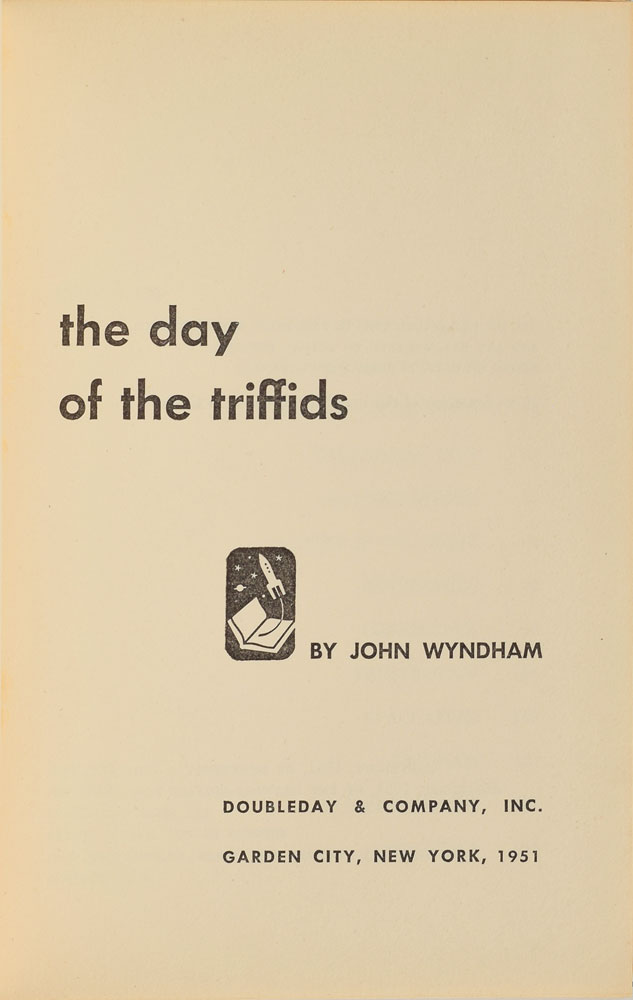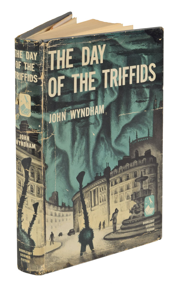 Unsigned book: The Day of the Triffids. First American edition. Garden City, NY: Doubleday, 1951. Hardcover with dust jacket, 5.5 x 8, 222 pages. Book condition: VG+/VG-, with significant creasing to dust jacket, and a small hole to the spine. In Wyndham's post-apocalyptic novel, a plague of blindness befalls the entire world, allowing the rise of an aggressive plant species. An important early sci-fi work.