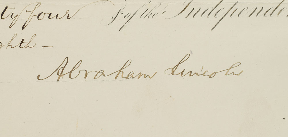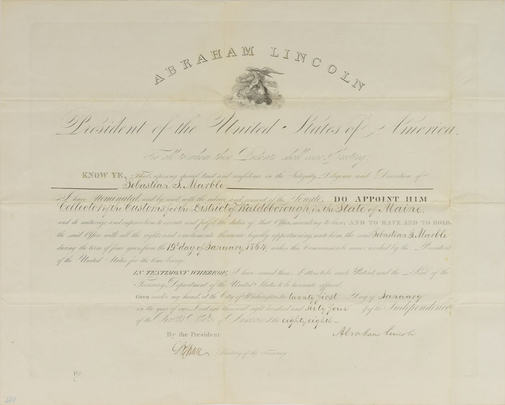 Civil War-dated partly-printed DS as president, one page, 18.5 x 15, January 21, 1864. President Lincoln appoints Sebastian S. Marble as "Collector of Customs for the District of Waldoborough, in the state of Maine." Signed at the conclusion by Lincoln, and countersigned by Salmon P. Chase as secretary of the Treasury. In very good to fine condition, with scattered light creasing, and splitting along intersecting folds; the signature is clear, bold, and unaffected. Sebastian Streeter Marble served as collector of customs for the Waldoboro district from 1862 to 1863, and then from 1864 to 1867. A delegate to the Republican National Conventions in 1864 and 1880, Marble later served as the 41st Governor of Maine. A day before signing this commission, Lincoln instructed Arkansas commander General Frederick Steele to permit elections following the adoption of the state's new antislavery constitution.