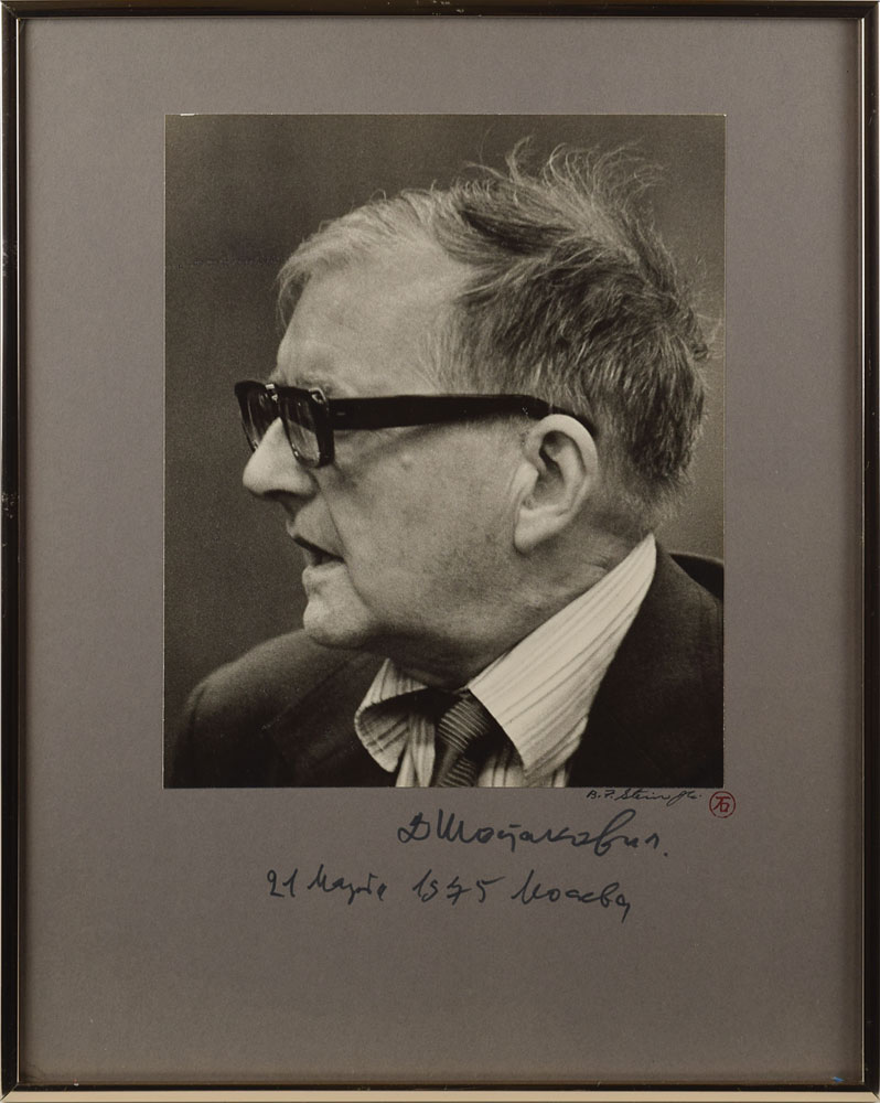 Soviet composer (1906-1975) whose fifteen symphonies occupy a place of central performance in the orchestral literature of the twentieth century. Outstanding matte-finish 10.25 x 12.5 photo by B. F. Stein affixed to its original 15.5 x 19.5 mount, signed on the mount in black felt tip in Cyrillic, "D. Shostakovich, 21 March 1975, Moscow." In fine condition. A fantastic example dated a little over four months before he died. Shostakovich is very scarce in signed photos, and this is by far the largest we have ever had—the handful of others have been postcard sized!
