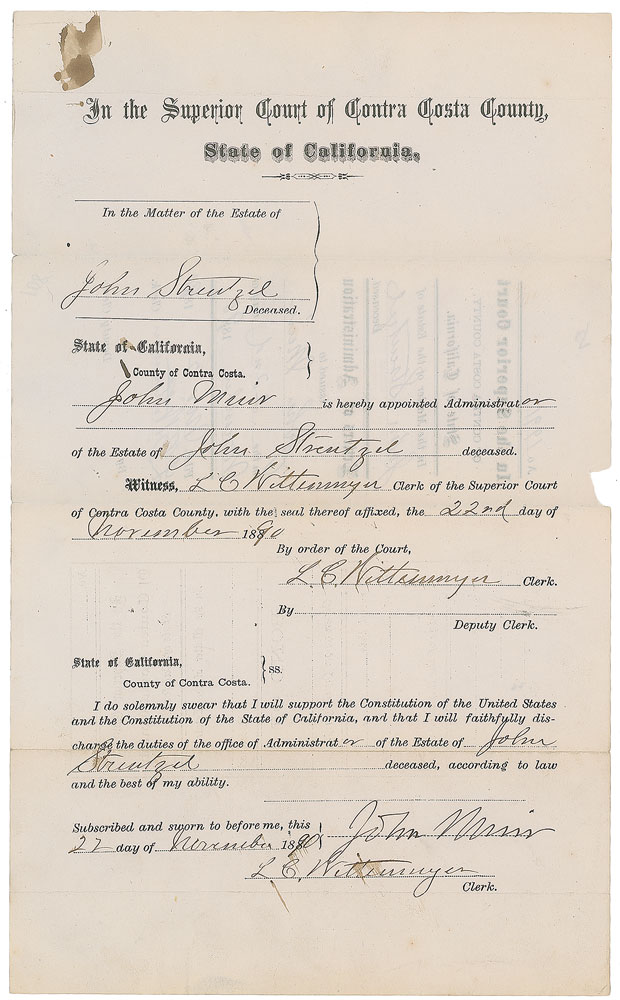 Partly-printed DS, one page, 8 x 13, November 22, 1890. Superior Court of Contra Costa County legal document, in part: "John Muir is hereby appointed Administrator of the Estate of John Strentzel deceased." Signed at the conclusion by Muir. In fine condition, with a stain to the top and a small area of paper loss to the right edge. In 1880, Muir married Louisa Strentzel, the daughter of Muir's good friend and companion, John Strentzel, a Polish-born physician who gained fame as a pioneer in the area of experimental California horticulture. When Strentzel passed away in October 1890, Muir and Louisa moved into the late doctor's 10,000 square foot home in Martinez, California, which is now preserved by the National Park Service as the John Muir National Historic Site.