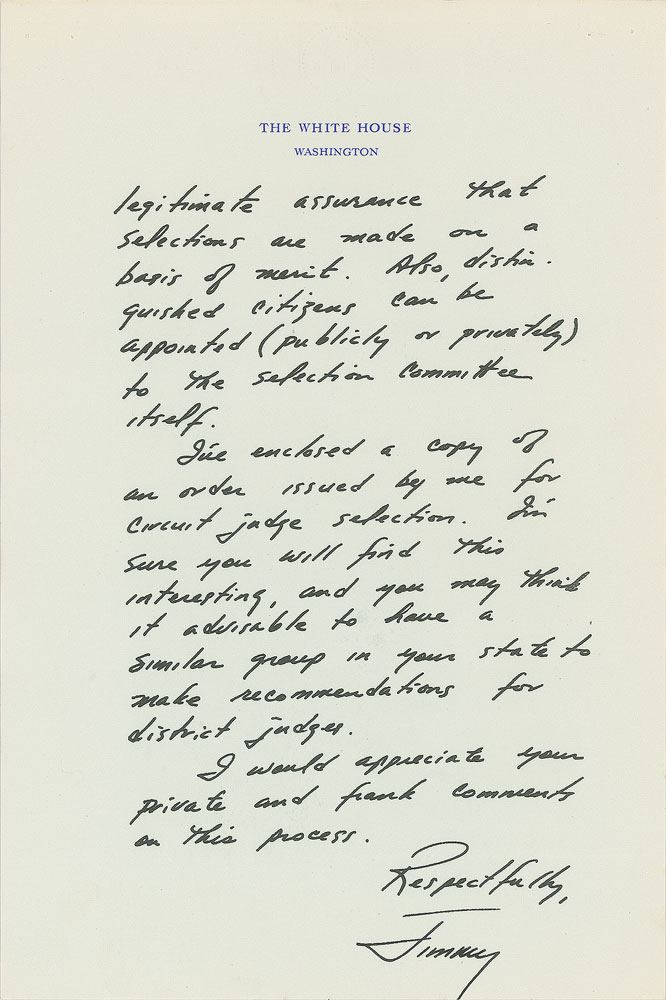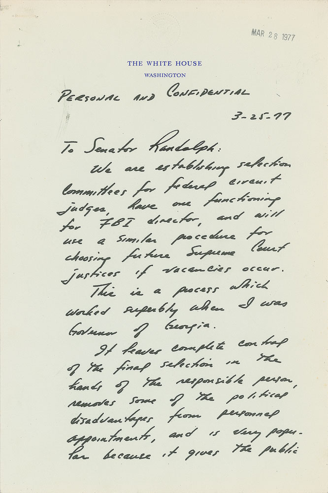 ALS as president, signed “Jimmy,” two pages, 7 x 10.5, White House letterhead, March 25, 1977. Letter to West Virginia Senator Jennings Randolph, in full: "We are establishing selection committees for federal circuit judges, have one functioning for FBI director, and will use a similar procedure for choosing future Supreme Court justices if vacancies occur. This is a process which worked superbly when I was Governor of Georgia. It leaves complete control of the final selection in the hands of the responsible person, removes some of the political disadvantages from personnel appointments, and is very popular because it gives the public legitimate assurance that selections are made on a basis of merit. Also, distinguished citizens can be appointed (publicly or privately) to the selection committee itself. I've enclosed a copy of an order issued by me for circuit judge selection. I'm sure you will find this interesting, and you may think it advisable to have a similar group in your state to make recommendations for district judges. I would appreciate your private and rank comments on this process." Carter has added below the letterhead: "Personal and Confidential." In fine condition, with staple holes to the upper left corner. Accompanied by the referenced executive order, headed: "Establishing the United States Circuit Judge Nominating Commission."