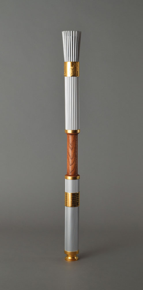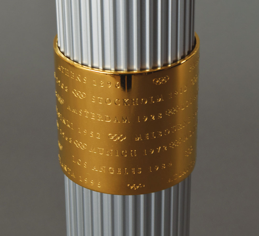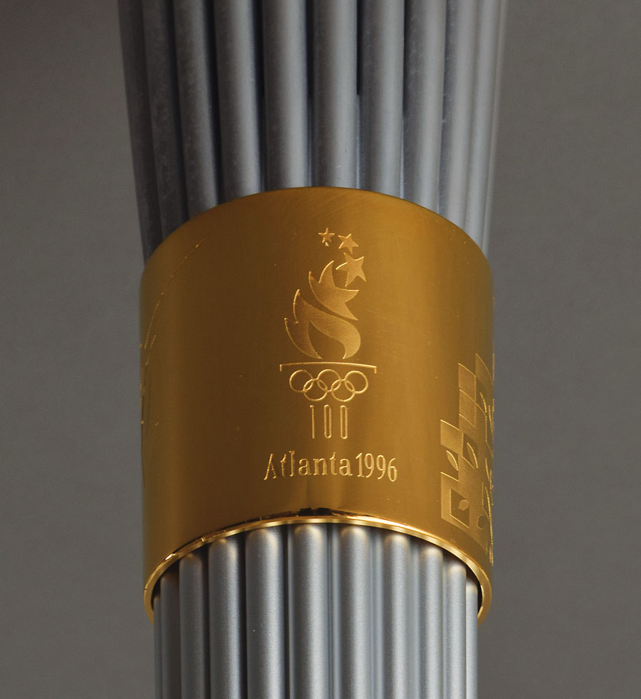 Official 1996 Atlanta Summer Olympics torch, constructed of gold-plated brass, aluminum, and Georgian pecan hardwood, measuring 31.75″ in length and 2.5″ at its widest point. Designed by Peter Mastrogiannis, the wooden handle represents the connection of the flame between heaven and earth, and the torch's twenty-two reeds, representing every host city of the Olympic Games since 1896, are gathered by bands at the top and bottom, with the top displaying the Atlanta Games logo and the quilt of leaves design, and the bottom band listing all Olympic cities and their dates since 1896. The torch relay was run from April 27 to July 19, 1966, and covered 26,875 km across the United States by over 12,000 torchbearers. Its journey included a trek on the Pony Express, a ride on the Union Pacific Railroad, and the first instance in which an Olympic relay torch made its way into space when it was carried aboard Space Shuttle Columbia as part of STS-78. A highly appealing relay torch from the Centennial Olympic Games.