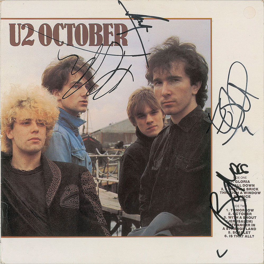 October album signed on the front cover in black felt tip, "Bono," "Edge," "Adam," and "Larry." In fine condition, with a small round sticker to the upper right corner. The record is included. Accompanied by a full letter of authenticity from REAL.