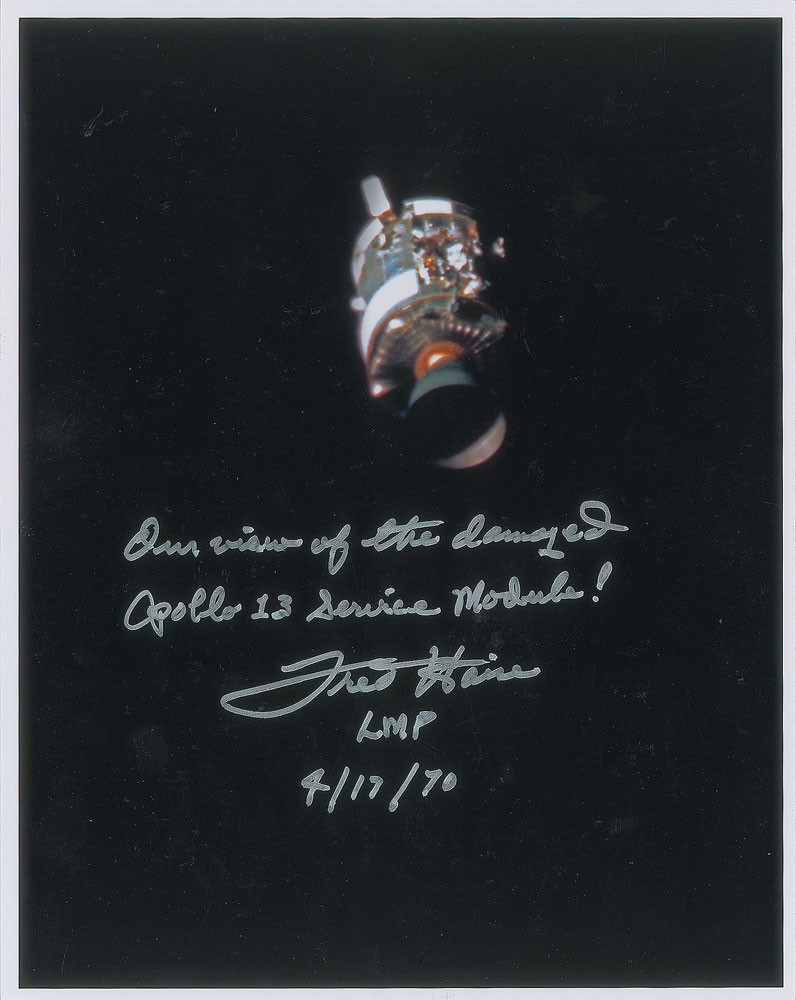 Color satin-finish 8 x 10 photo of the crippled Apollo 13 service module floating in space, signed in silver ink, "Our view of the damaged Apollo 13 Service Module! Fred Haise, LMP, 4/17/70." In very fine condition.