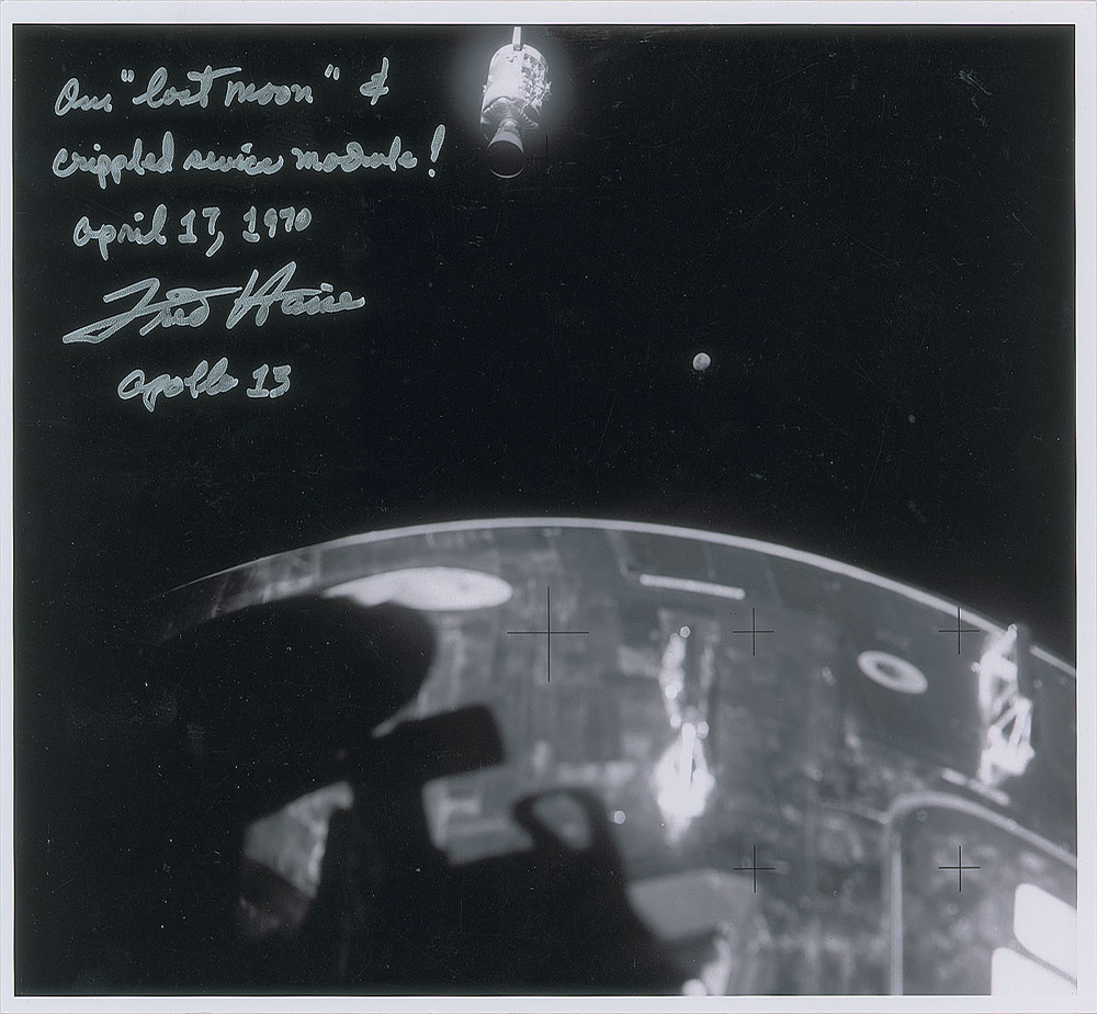 Highly appealing satin-finish 10 x 8 photo as taken from the lunar module 'lifeboat,' which shows the damaged service module and the moon, signed in silver ink, "Our 'lost moon' & crippled service module! April 17, 1970, Fred Haise, Apollo 13." In very fine condition.