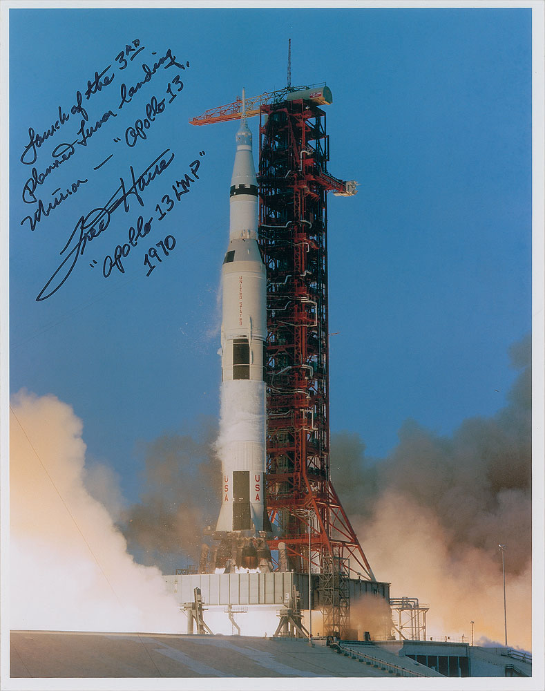 Color satin-finish 8 x 10 photo of the Apollo 13 liftoff, signed in black felt tip, "Launch of the 3rd planned lunar landing mission—'Apollo 13,' Fred Haise, 'Apollo 13 LMP,' 1970." In very fine condition.