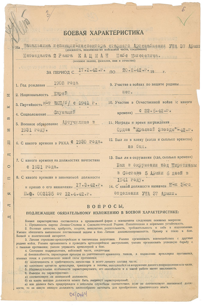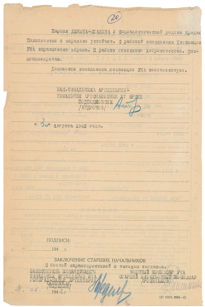 Soviet military commander (1902-1960) who served as Chief Marshal of the Artillery in the Soviet Armed Forces. He was killed in an explosion at Baikonur Cosmodrome during the eponymous Nedelin catastrophe, when a prototype of the Soviet ICBM R-16 exploded while being prepared for a test. Untranslated DS in Cyrillic, one page both sides, 8 x 12, August 31, 1942. Official document signed at the conclusion in blue pencil by Nedelin. In fine condition, with wear to the top edge. Nedelin inadvertently played a key role in ushering in the Space Age by concluding that rockets were the ideal means to deliver a nuclear warhead to the United States instead of bombers, and ordered Sergei Korolev to develop the massive R-7 ICBM capable of carrying a large warhead to the United States. This rocket and its derivatives, while never an effective ICBM, was powerful enough to launch Sputnik.