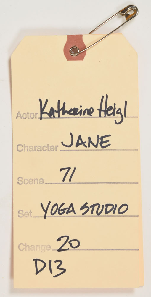 Pale blue t-shirt and black tank top, worn on screen by Katherine Heigl in her role as Jane Nichols in the 2008 romantic comedy 27 Dresses. The short-sleeve wide-neck shirt was made by James Perse and is size 2, and the ribbed tank top, also made by James Perse, is a size 1. In overall fine condition. Accompanied by a certificate of authenticity from Premiere Props, and the original wardrobe tag, which notes that Heigl’s character wore the outfit in a “Yoga Studio” during scene 71.