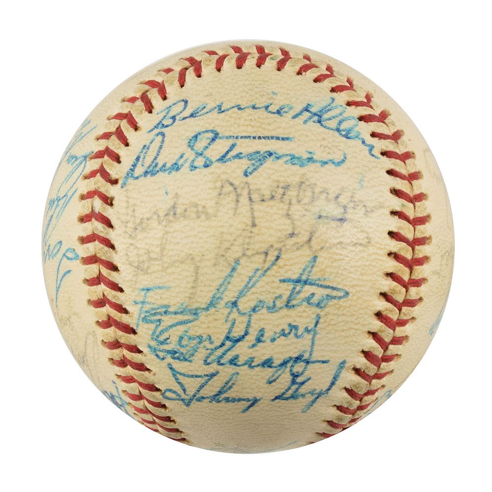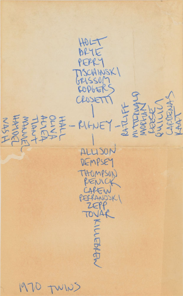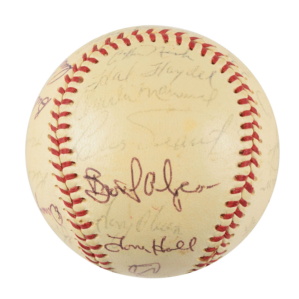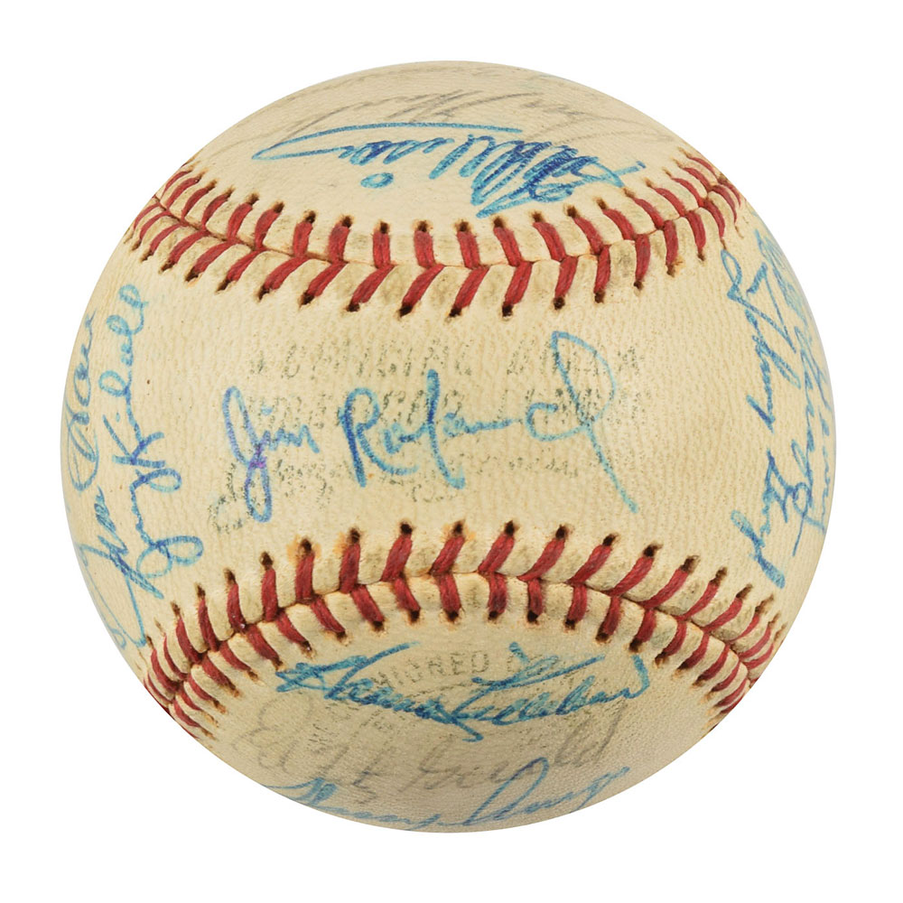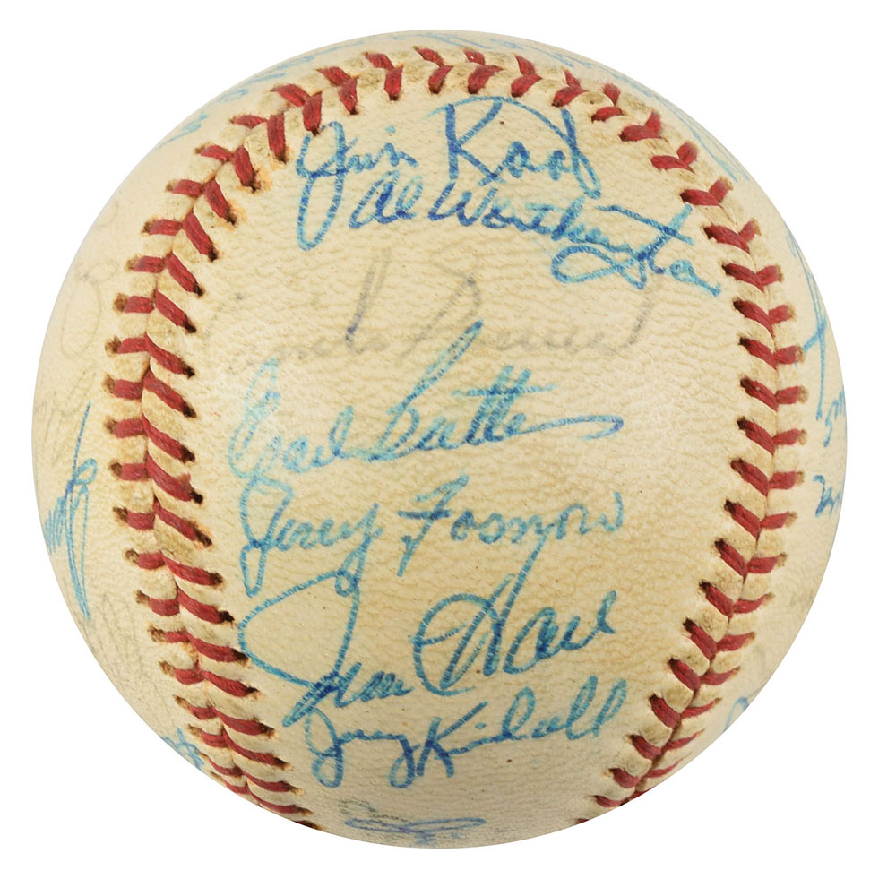 Two Minnesota Twins team-signed official American League baseballs, one signed by the 1964 team and the other signed by the 1970 team. The 1964 ball is signed in ballpoint on the sweet spot and side panels by 30, including Harmon Killebrew, Ed Fitz Gerald, Gerry Arrigo, Floyd Baker, Jim Perry, Sam Mele (ss), Zoilo Versalles (ss), Bernie Allen, Dick Stigman, Gordon Maltzberger, Johnny Klippstein, Frank Kostro, Ron Henry, Hal Naragon, Johnny Goryl, Jim Roland, Jim Kaat, Al Worthington, Camilo Pascual, Earl Battey, Jerry Fosnow, Jimmie Hall, Jerry Kindall, Bob Allison, Don Mincher, Jerry Zimmerman, Tony Oliva, Rich Rollins, Mudcat Grant, and Bill Pleis. The 1970 ball is signed in ballpoint on the sweet spot and side panels by 31, including: Harmon Killebrew (lightly over the league stamp), Rod Carew, Cotton Nash, Hal Haydel, Charlie Manuel, Luis Tiant, Brant Alyea, Tony Oliva, Tom Hall, Jim Kaat, Leo Cardenas, Frank Quilici, Rich Reese, Vern Morgan, George Mitterwald, Paul Ratliff, Frank Crosetti, Buck Rodgers, Marv Grissom, Tom Tischinski, Jim Perry, Steve Brye, Jim Holt, Bob Allison, Rick Dempsey, Danny Thompson, Rick Renick, Ron Perranoski, Bill Zepp, and Cesar Tovar. The Bill Rigney signature on the sweet spot is clubhouse. In overall very good to fine condition, with various signatures a few shades light.