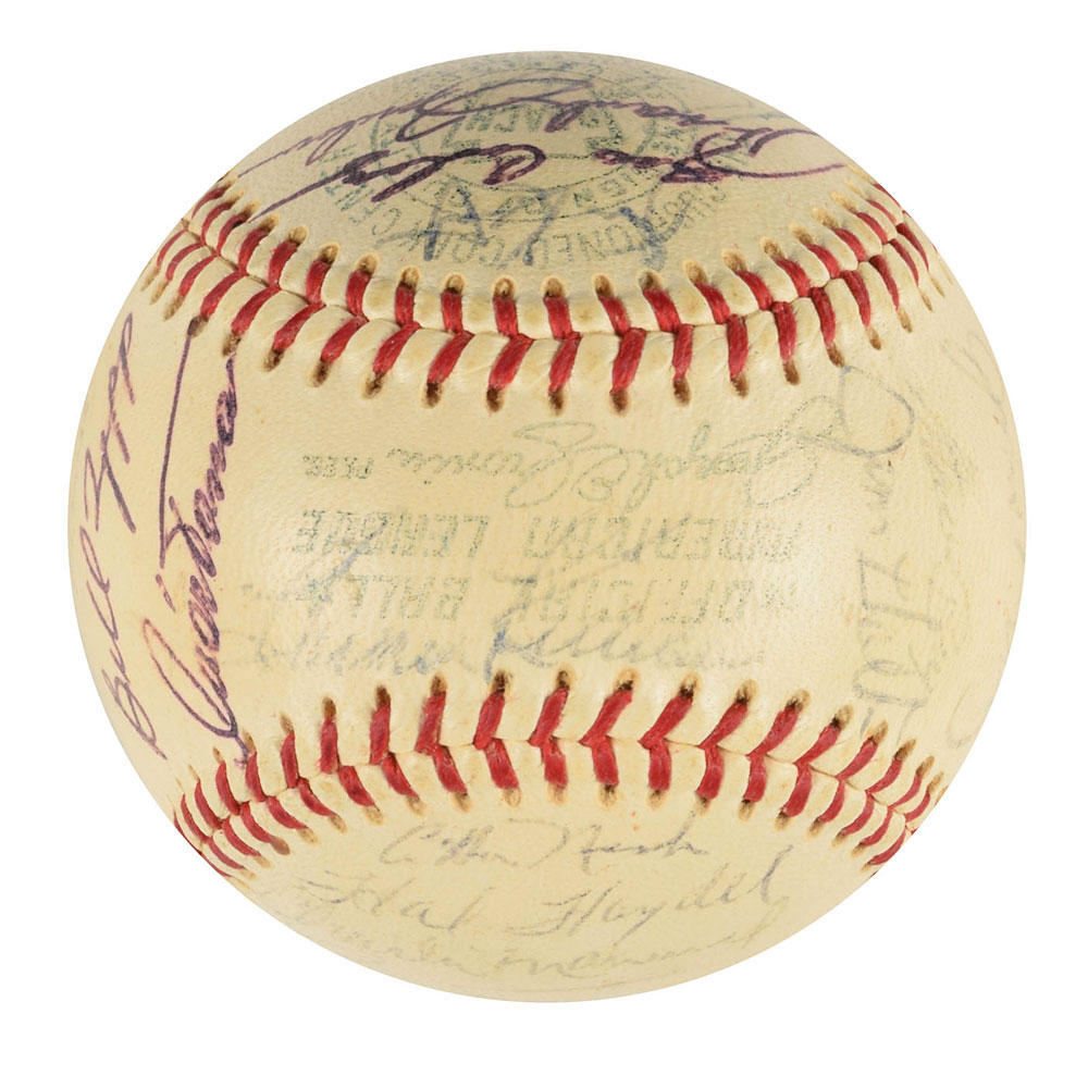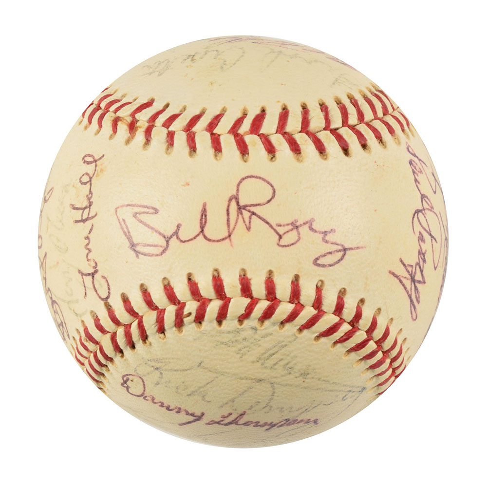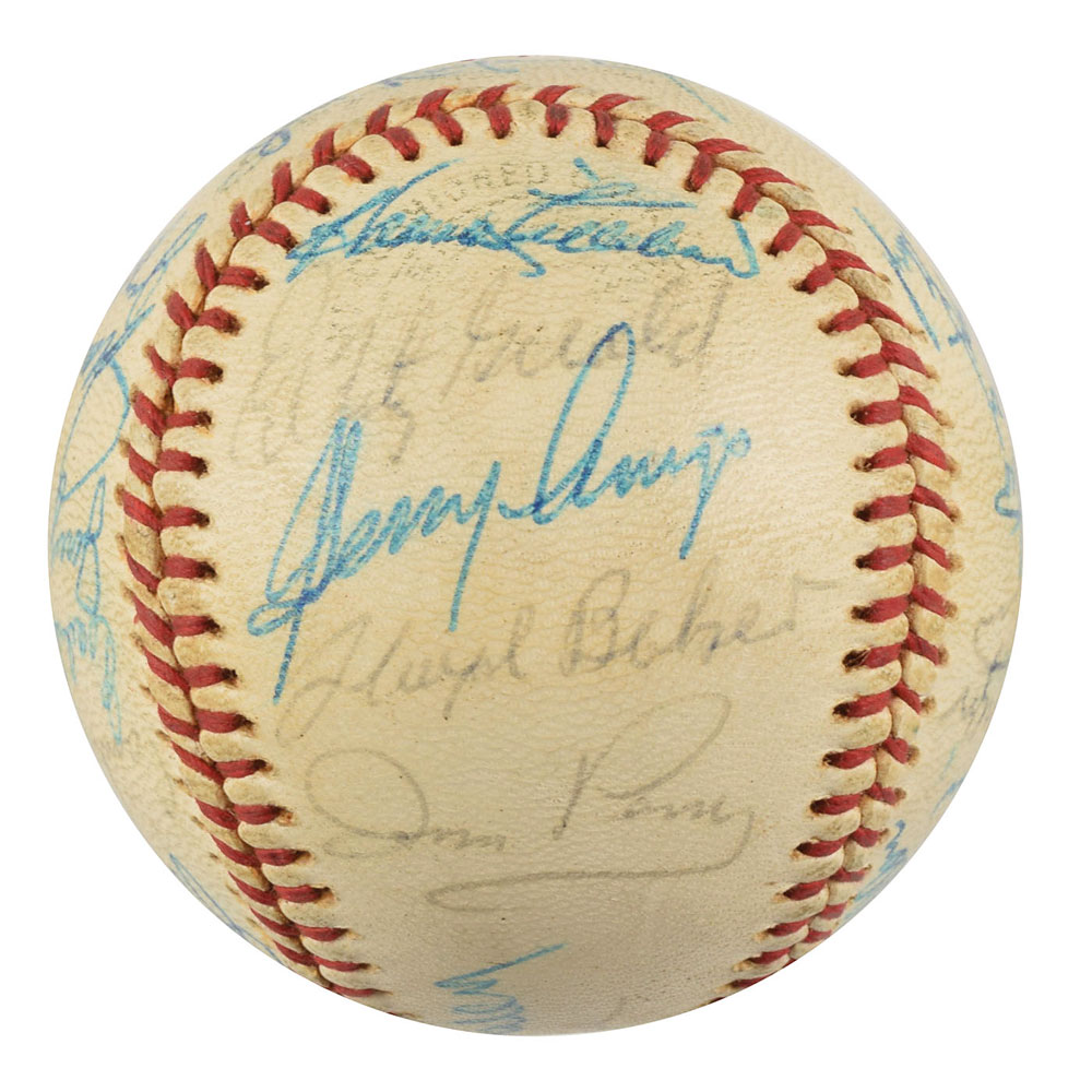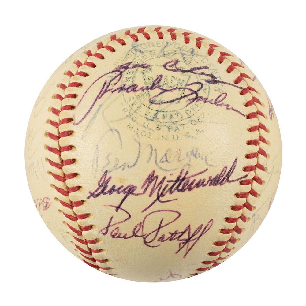 Two Minnesota Twins team-signed official American League baseballs, one signed by the 1964 team and the other signed by the 1970 team. The 1964 ball is signed in ballpoint on the sweet spot and side panels by 30, including Harmon Killebrew, Ed Fitz Gerald, Gerry Arrigo, Floyd Baker, Jim Perry, Sam Mele (ss), Zoilo Versalles (ss), Bernie Allen, Dick Stigman, Gordon Maltzberger, Johnny Klippstein, Frank Kostro, Ron Henry, Hal Naragon, Johnny Goryl, Jim Roland, Jim Kaat, Al Worthington, Camilo Pascual, Earl Battey, Jerry Fosnow, Jimmie Hall, Jerry Kindall, Bob Allison, Don Mincher, Jerry Zimmerman, Tony Oliva, Rich Rollins, Mudcat Grant, and Bill Pleis. The 1970 ball is signed in ballpoint on the sweet spot and side panels by 31, including: Harmon Killebrew (lightly over the league stamp), Rod Carew, Cotton Nash, Hal Haydel, Charlie Manuel, Luis Tiant, Brant Alyea, Tony Oliva, Tom Hall, Jim Kaat, Leo Cardenas, Frank Quilici, Rich Reese, Vern Morgan, George Mitterwald, Paul Ratliff, Frank Crosetti, Buck Rodgers, Marv Grissom, Tom Tischinski, Jim Perry, Steve Brye, Jim Holt, Bob Allison, Rick Dempsey, Danny Thompson, Rick Renick, Ron Perranoski, Bill Zepp, and Cesar Tovar. The Bill Rigney signature on the sweet spot is clubhouse. In overall very good to fine condition, with various signatures a few shades light.
