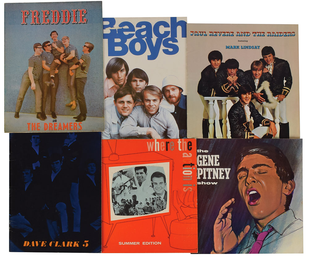 Group of six vintage 1960s US tour books and programs, with acts including: Dave Clark 5 (1964); Beach Boys (1965); Paul Revere and the Raiders (1968); The Gene Pitney Show, featuring the Buckinghams, Music Explosion, Happenings, Easy Beats, and Fifth Estate (1967); "Where The Action Is," featuring Young Rascals, Critters, Steve Alaimo, and Keith Allison (1966); and Freddie and the Dreamers, with Beau Brummels and The McCoys (1965). In overall fine condition, with some waviness to the Gene Pitney Show program, and a spot of surface loss to the front of the Beach Boys program.