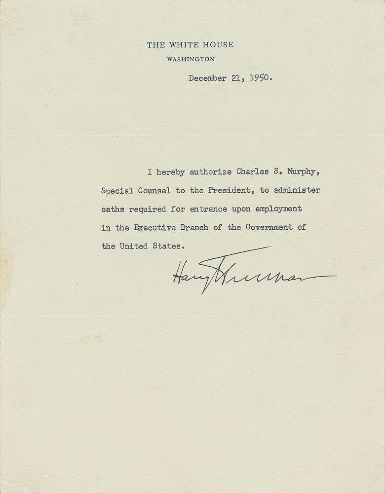 Unusual DS as president, one page, 6.75 x 8.75, White House letterhead, December 21, 1950. Official typed authorization document, in full: "I hereby authorize Charles S Murphy, Special Counsel to the President, to administer oaths required for entrance upon employment in the Executive Branch of the Government of the United States." In fine condition, with a light stain to the left edge, and light creasing to the corners. Accompanied by an unsigned engraved portrait.