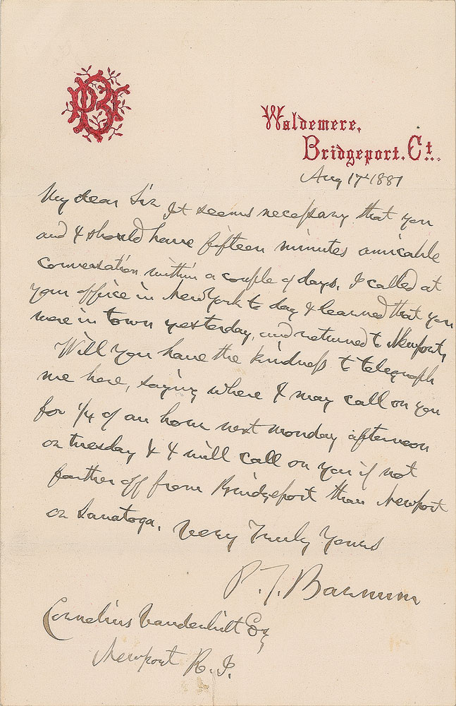 ALS, one page, 4.25 x 6.75, personal Waldemere letterhead, August 17, 1881. Letter to influential magnate and philanthropist Cornelius Vanderbilt, in part: "It seems necessary that you and I should have fifteen minutes amicable conversation within a couple of days. I called at your office in New York to day & learned that you were in town yesterday, and returned to Newport. Will you have the kindness to telegraph me here, saying where I may call on you for 1/4 of an hour." In fine condition. An interesting association piece.