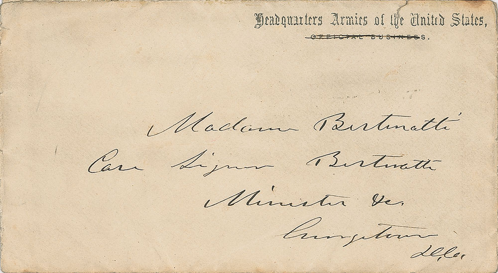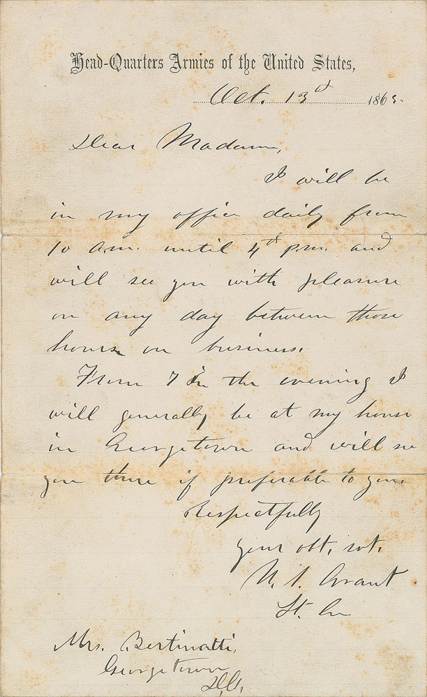 ALS signed “U. S. Grant, Lt. Gen.,” one page, 5 x 8, Head-Quarters Armies of the United States letterhead, October 13, 1865. Letter to Madame Bertinatti, in part: "I will be in my office daily from 10 a.m. until 4 p.m. and will see you with pleasure on any day between those hours on business. From 7 in the evening I will generally be at my house in Georgetown and will see you there if preferable to you." In very good condition, with soiling, foxing, and nearly complete separation along the two horizontal mailing folds (repaired with archival tape to the reverse). Accompanied by the original mailing envelope.