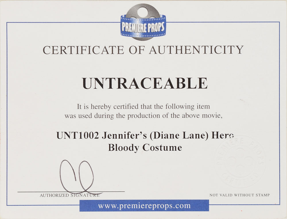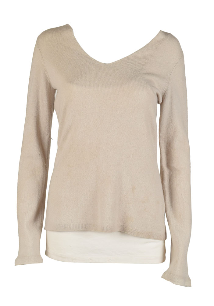 White spaghetti-strap tank top undershirt and beige long-sleeve sweater, worn on screen by Diane Lane in her role as FBI Agent Jennifer Marsh in the 2008 serial killer thriller Untraceable. The white cotton/modal tank top, made by Gap, is a size medium and has a small faux blood stain on the front. The beige cashmere sweater, made by Anne Taylor, is a size small and has a small hole in the back. In overall fine condition. Accompanied by a certificate of authenticity from Premiere Props.