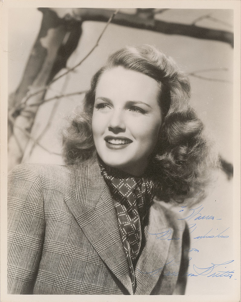 American film and television actress (1919-1980) who is best known for her Western films opposite Randolph Scott, Joel McCrea, and Gene Autry, and for her role as Pam North on the television and radio series Mr. and Mrs. North. Vintage matte-finish 8 x 10 photo of Britton in a beautiful head-and-shoulders pose, signed and inscribed in blue fountain pen, "To Warren—Best wishes, from Barbara Britton.” In fine condition.
