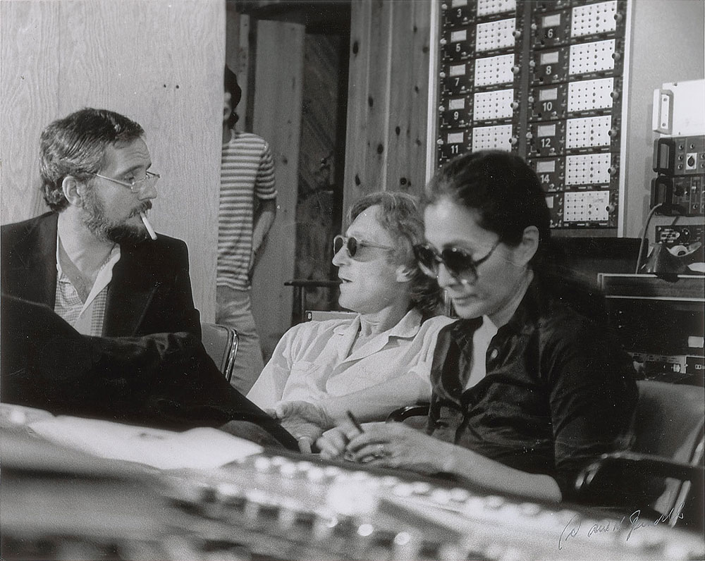 Original glossy 10 x 8 silver gelatin photo of John Lennon and Yoko Ono at a soundboard, taken in 1980 by Double Fantasy photographer David M. Spindel, signed in the lower right corner in silver ink by Spindel. Reverse bears Spindel's copyright stamp. In very fine condition.