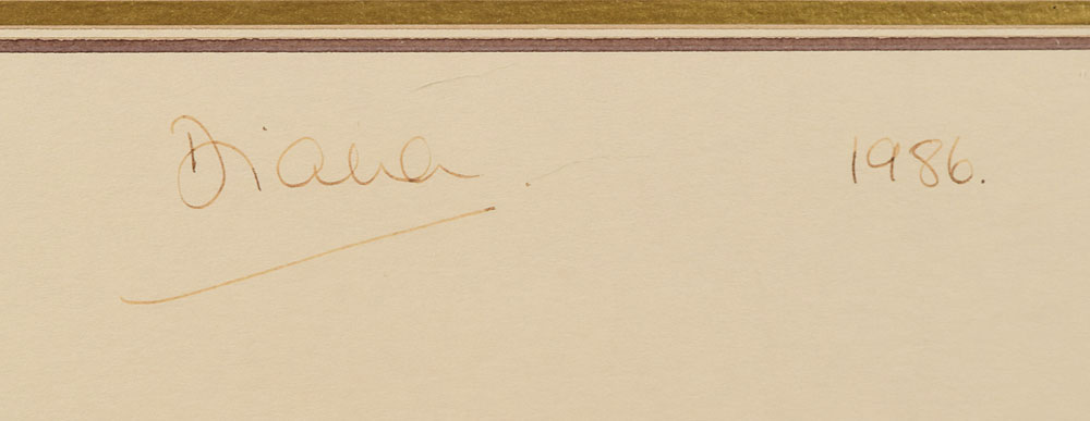 Impressive color satin-finish 15.5 x 19 close-up photo of Diana, presented in a 21.5 x 28 mat, signed on the mat in ink, "Diana, 1986." In fine condition, with faint staining to the right side of the mat, the signature a couple of shades light, and a slightly grainy quality to the image. A fantastic, imposing piece.