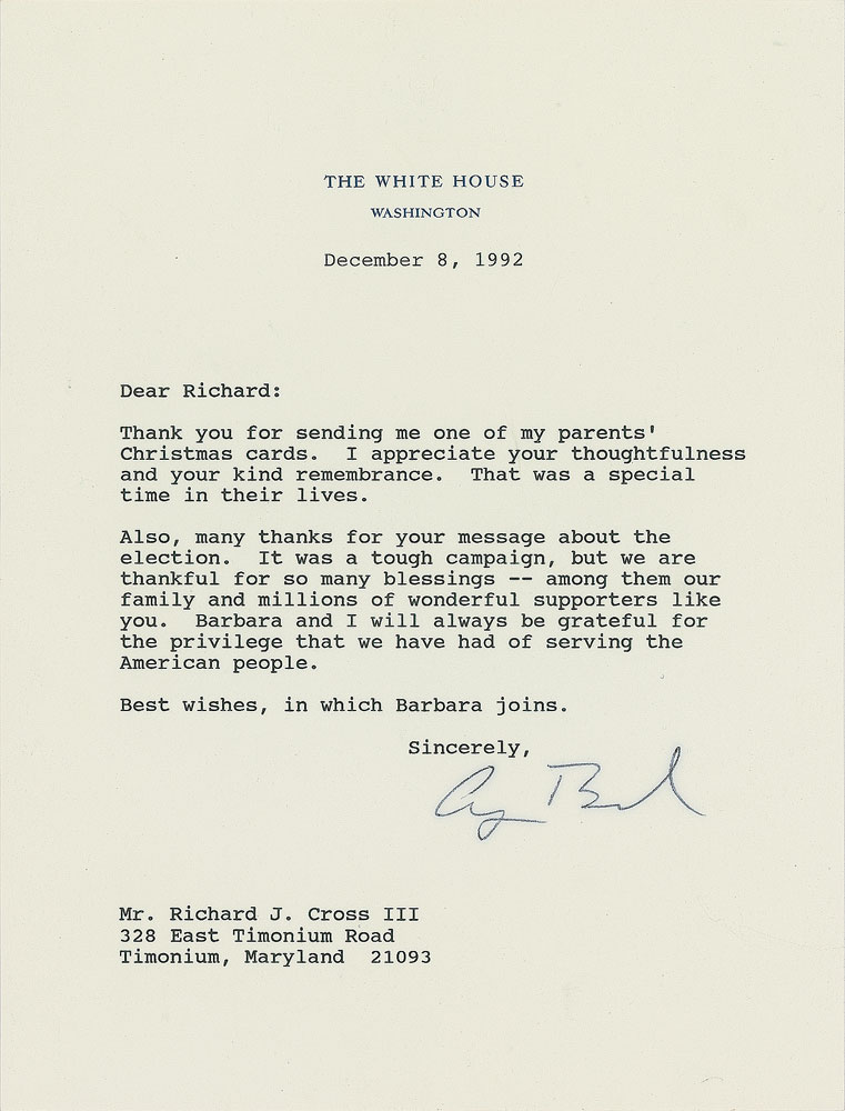 TLS as president, one page, 6.75 x 8.75, White House letterhead, December 8, 1992. Letter to Richard J. Cross III, in full: "Thank you for sending me one of my parents' Christmas cards. I appreciate your thoughtfulness and your kind remembrance. That was a special time in their lives. Also, many thanks for your message about the election. It was a tough campaign, but we are thankful for so many blessings—among them our family and millions of wonderful supporters like you. Barbara and I will always be grateful for the privilege that we have had of serving the American people. Best wishes, in which Barbara joins." In very fine condition.