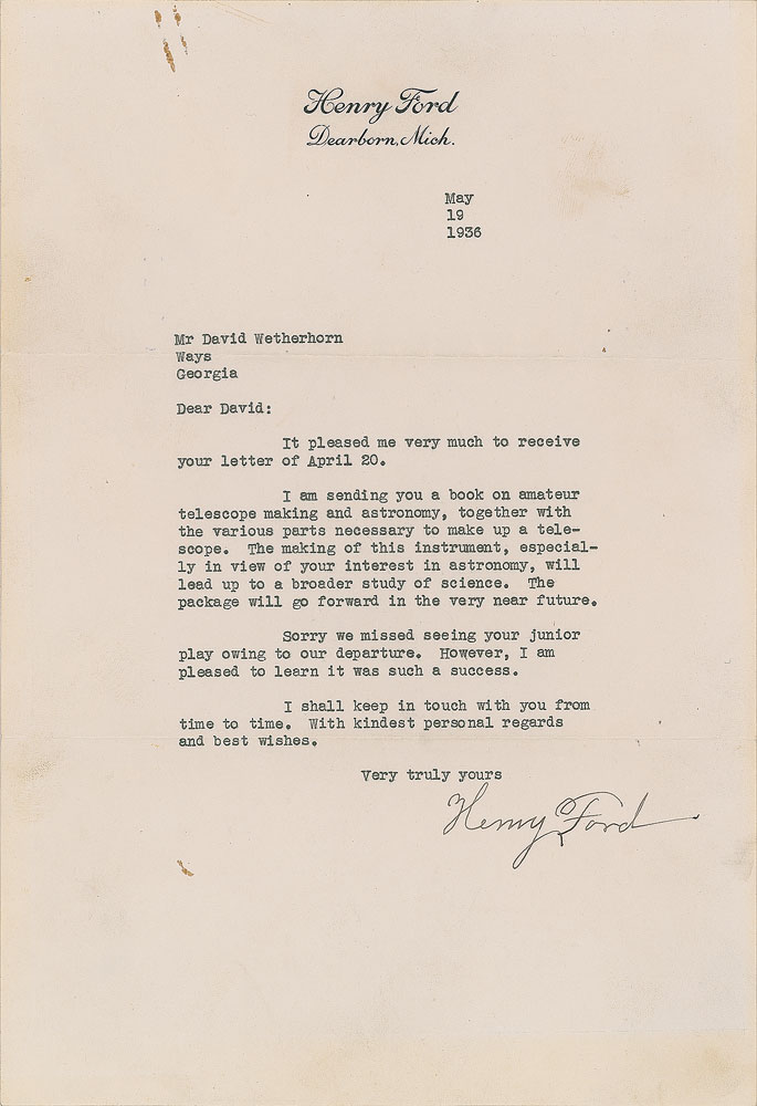 TLS, one page, 7.25 x 10.5, personal letterhead, May 19, 1936. Letter to David Wetherhorn, in part: "I am sending you a book on amateur telescope making and astronomy, together with the various parts necessary to make up a telescope. The making of this instrument, especially in view of your interest in astronomy, will lead up to a broader study of science. The package will go forward in the very near future. Sorry we missed seeing your junior play owing to our departure. However, I am pleased to learn it was such a success. I shall keep in touch with you from time to time." In fine condition, with scattered light soiling, and a rust paperclip impression to the upper edge.