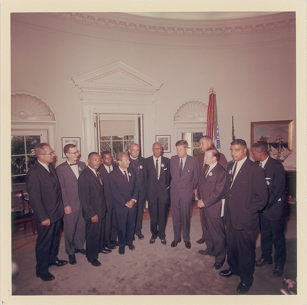 Original vintage color glossy 5 x 5 photo of President John F. Kennedy, Vice President Lyndon B. Johnson, and the organizers of the 'March on Washington for Jobs and Freedom' (including Martin Luther King, Jr., John Lewis, and others), taken by official White House photographer Cecil W. Stoughton on August 28, 1963. Reverse bears "A Kodak Paper" watermarks and a pencil notation, "C277-1-63." In very fine condition. This photograph derives from Stoughton's personal collection, and was retained by him as his own file copy. Provenance: The Estate of Cecil W. Stoughton, Bonhams.