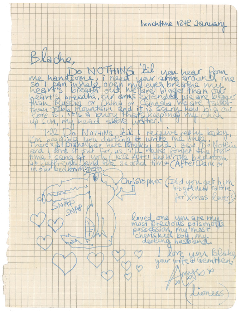 ALS signed “Amy, xxxx (lioness),” one page, 7.5 x 9.75, January 12, no year. Letter to her husband Blake Fielder-Civil, in full: "Do nothing 'til you hear from me handsome, I need your arms around me so I can inhale, open my eyes, breathe my heart's breathe out. We are bigger than our heart's breadth, our arms extended, we are bigger than Russia or China or Canada. We are taller than Fable Mountain and it is scary how big our love is, it's a buoy that's keeping my chin up son, my head above water. I'll do nothing til I receive reply baby, I'm begging you darling to write me once…There's a piano bar here Blakey and I saw Do Nothin' and I tore it out for us. I'll never forget the first time I sang at you (Jazz After Dark? The bedroom at Jeffrey's?) and the second time (After Dark or in our bedroom) Defo. Loved one you are my most precious poisonous possession, my most cherished boy, my darling husband. I love you Blake, your wife & GemHen." Winehouse draws several hearts around a sketch of a baby alligator or crocodile, which she names "Christopher," and asks: "(Did you get him his golden rattle for Xmas lover?)." In fine condition.
