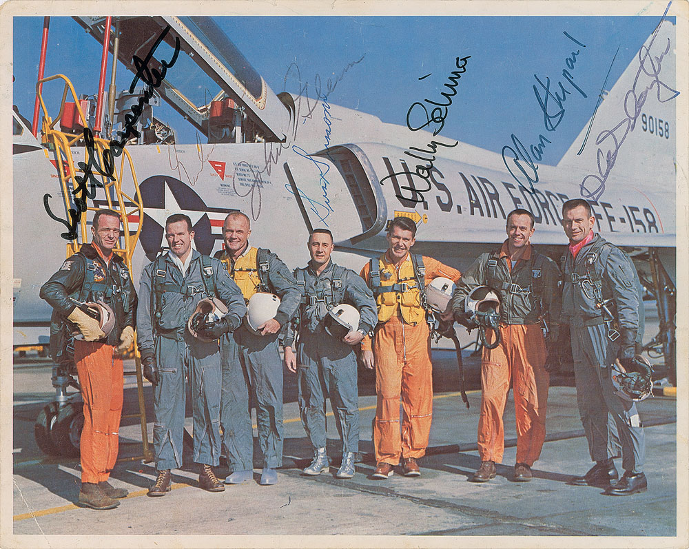 Official color 10 x 8 NASA lithograph of NASA's original astronauts posing in front of an Air Force fighter jet, signed in various inks by all seven: Scott Carpenter, Gordon Cooper, John Glenn, Gus Grissom, Wally Schirra, Alan Shepard, and Deke Slayton. In very good condition, with moderate overall creasing, and a heavier crease to the lower left corner. Accompanied by an unsigned postcard featuring a similar image. From the collection of aerospace memorabilia specialist Ken Havekotte. A desirable uninscribed example.