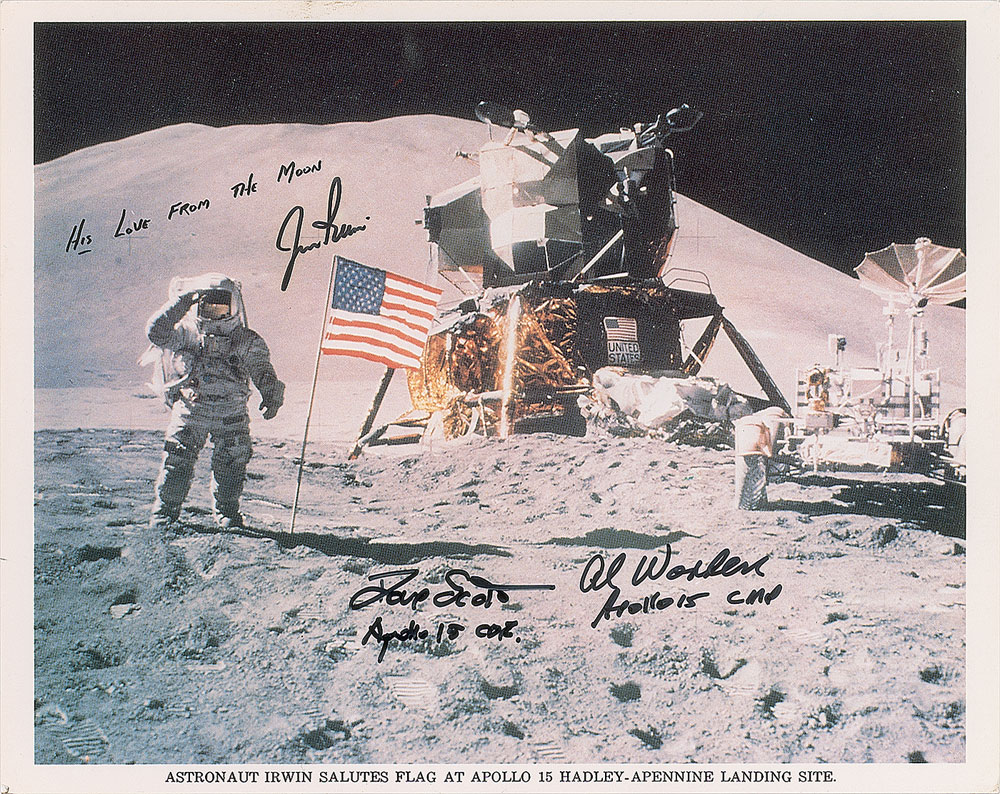Color 10 x 8 reprint NASA lithograph of Jim Irwin saluting the flag on the lunar surface during Apollo 15, signed in black felt tip by the full crew, "Jim Irwin," "Dave Scott, Apollo 15 CDR," and "Al Worden, Apollo 15 CMP." The image bears a typical pre-printed inscription, "His Love from the Moon." In fine condition. From the collection of aerospace memorabilia specialist Ken Havekotte.