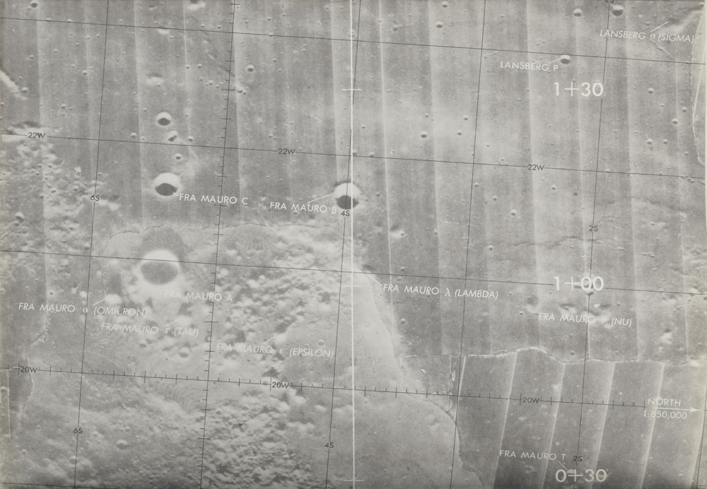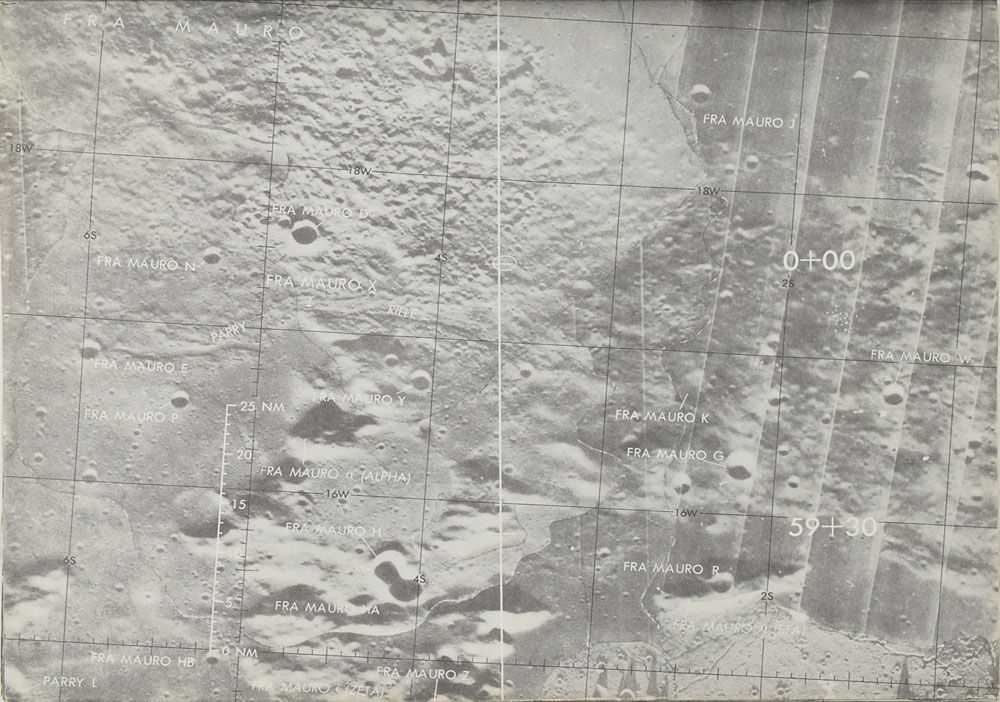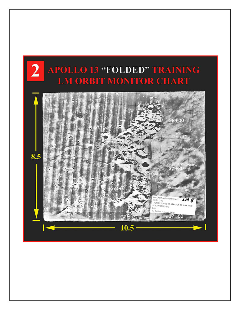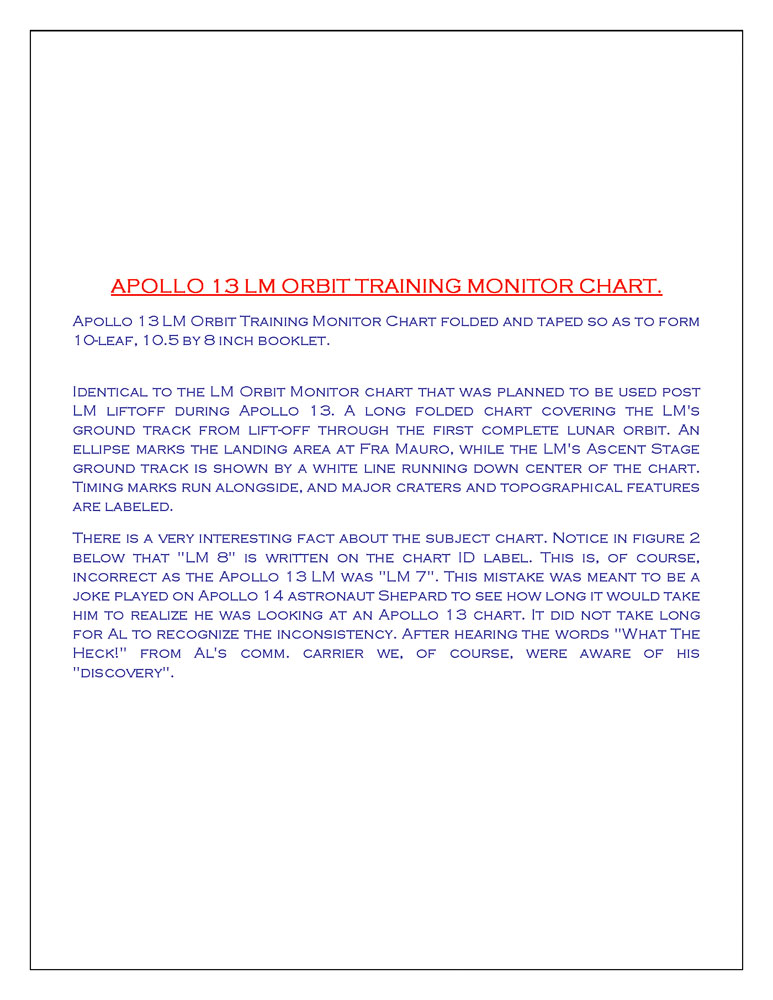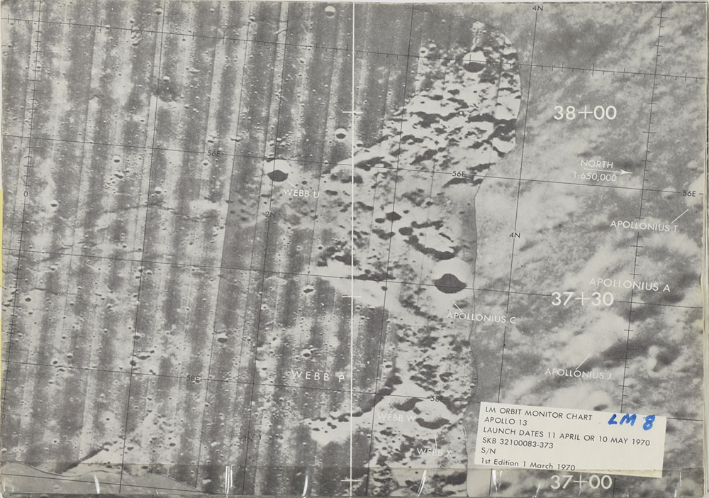 First edition Lunar Module Orbit Monitor Chart used in training for the Apollo 13 mission, folded and taped so as to form a 10-leaf booklet, measuring 10.5 x 8, issued for potential launch dates of April 11 or May 10, 1970, SKB 32100083-373, March 1, 1970, marked in blue felt tip, “LM 8.” This training chart, which covers the LM's ground track from liftoff through the first complete lunar orbit, is identical to the LM Orbit Monitor chart that was planned to be used post LM liftoff during Apollo 13. The landing area at Fra Mauro can be viewed near the back of the booklet, and the LM's Ascent Stage ground track is shown by a white line running down the center of the chart. Timing marks run alongside, and major craters and topographical features are also labeled. Of particular note is the "LM 8" notation written on the chart ID label. This is, of course, incorrect given that the Apollo 13 LM was ‘LM 7.’ This notation was intended as a joke to be played on Apollo 14 astronaut Shepard to see how long it would take him to realize he was looking at an Apollo 13 chart. The consignor notes that it did not take the Apollo 14 commander very long to notice the inconsistency. In fine condition. From the collection of Dan Schaiewitz, who worked as Extravehicular Crew Training Engineer at KSC.