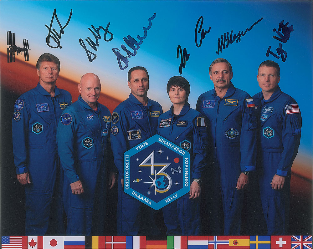 Color satin-finish 10 x 8 photo of the International Space Station Expedition 43 crew, signed in black felt tip by all six members: Terry Virts, Anton Shkaplerov, Samantha Cristoforetti, Gennady Padalka, Mikhail Korniyenko, and Scott Kelly. In very good to fine condition, with a light horizontal crease across the image. This Expedition to the ISS commenced on March 11, 2015, with the undocking of Soyuz TMA-14M; onboard were Padalka, who would stay for six months, as well as Kelly and Korniyenko, who were to remain on the space station for just short of a full year to study the effects of long duration spaceflight on the human condition. The 42/43 crew of Shkaplerov, Cristoforetti, and Virts cycled off on June 11, 2015.