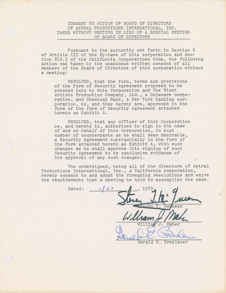 DS, signed “Steven T. McQueen,” one page, 8.5 x 11, January 27, 1972. Document headed "Consent to action of board of directors of Astral Productions International, Inc., taken without meeting in lieu of a special meeting of board of directors," by which the board agrees to resolutions concerning banking and signing authority. Signed at the conclusion by Steve McQueen, William J. Maher, and Gerald E. Breslauer. In fine condition, with three filing holes to the left edge.
