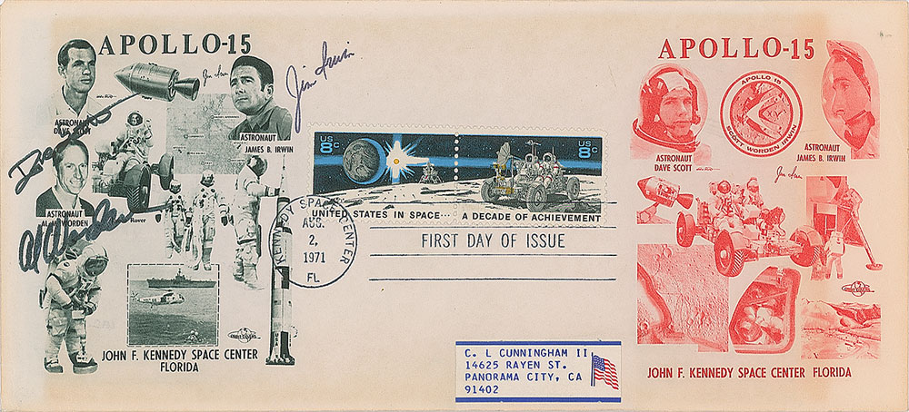 Uncommon FDC, 9.5 x 4, with a pair of cachets commemorating the crew of Apollo 15, signed in black felt tip by Dave Scott, Al Worden, and Jim Irwin. In fine condition, with light toning.