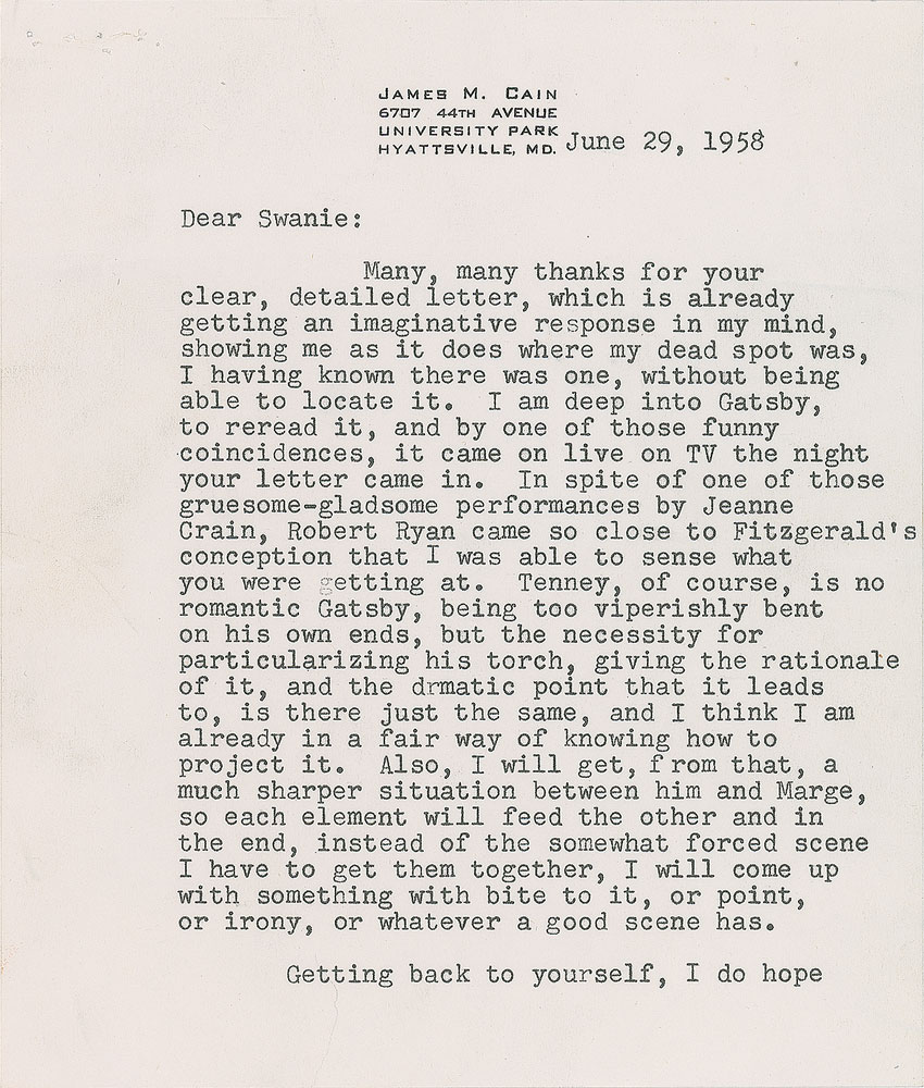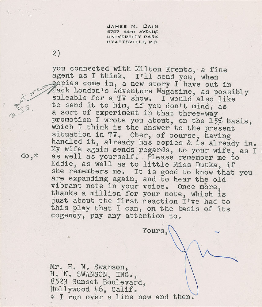TLS signed “Jim,” two pages, 6 x 7, personal letterhead, June 29, 1958. Letter to famed Hollywood agent H. N. Swanson, in part: "I am deep into Gatsby, to reread it, and by one of those funny coincidences, it came on live on TV the night your letter came in. In spite of one of those gruesome-gladsome performances by Jeanne Crain, Robert Ryan came so close to Fitzgerald's conception that I was able to sense what you were getting at. Tenney, of course, is no romantic Gatsby, being too viperishly bent on his own ends, but the necessity for particularizing his torch, giving the rationale of it, and the dramatic point that it leads to, is there just the same, and I think I am already in a fair way of knowing how to project it…Getting back to yourself, I do hope you connected with Milton Krents, a fine agent as I think. I'll send you, when copies come in, a new story I have out in Jack London's Adventure Magazine, as possibly saleable for a TV show." In fine condition, with a corner crease and staple holes to the upper left.