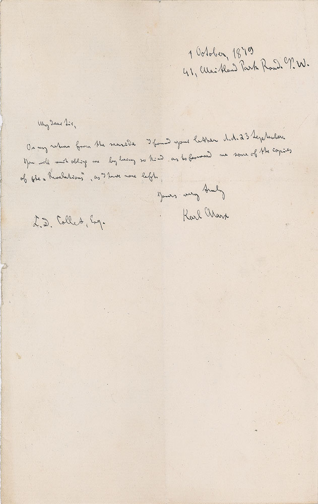 Extremely rare ALS in English, one page, 4.5 x 7, October 1, 1879. Written from 41 Maitland Park Road in London, a letter to Collet Dobson Collet. In full: “On my return from the seaside I found your letter d’d 23 September. You will much oblige me by being so kind as to forward me some of the copies of the ‘Revelations,’ as I have none left.” In very good condition, with intersecting folds, moderate wrinkling, and a few creases; the sheet is bright, the writing dark, precise, and easily legible in spite of Marx’s distinctive tiny hand.