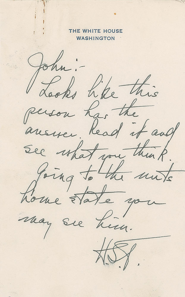 ANS as president signed "H. S. T.," one page, 5 x 8, White House letterhead, no date. Note to Secretary of the Treasury John Snyder concerning a lengthy letter written to Truman from a Stockton, California, inventor. Truman writes: "Looks like this person has the answer. Read it and see what you think. Going to the nuts home state you may see him." The letter Truman refers to, which is included, is from Charles Edwin Ashton. The back of the last page reads, "Mrs. Truman will you kindly give this to Mr. Truman when you are alone as no one will see it and after he has read it please destroy it. Thank You so much." The letter, two pages, both sides, reads, in part: "Now as to my plan to pay the National debt, here it is. Present a bill to both houses providing for a repeal of all kinds of taxes such as Real Estate, Personal Property, Income, Inheritance, Vacation and Auto Taxes and in their place a 3¢ tax on every dollar spent for any thing…Now Christ said to them that give it shall be given. So I say to you have a bill passed by Congress to give all old people in U.S. over 60 years of age who will stop competing for wages $50.00 a week each which must all be spent in 7 days…I am planning on taking over the old people myself with my new great invention the greatest the world has yet seen. With my new invention working together I will go on a non-stop flight around the world in 24 hours. I wish you could see my drawings as quite a few of confidential friends have and some navy technicians have and all have said 'We see no reason at all why it will not work.' I am planning on this invention helping all countries to an elimination of their poor. If you can't get away incognito come out and see my drawings and if I can get any money from my cotton picker I will have a working model in 30 days from the time I get the money and in less than 30 days from then I will have an auto running by the power of this invention. Do not mention this to a soul." In fine condition, with a paperclip to top edge, and scattered creases to Ashton's letter.