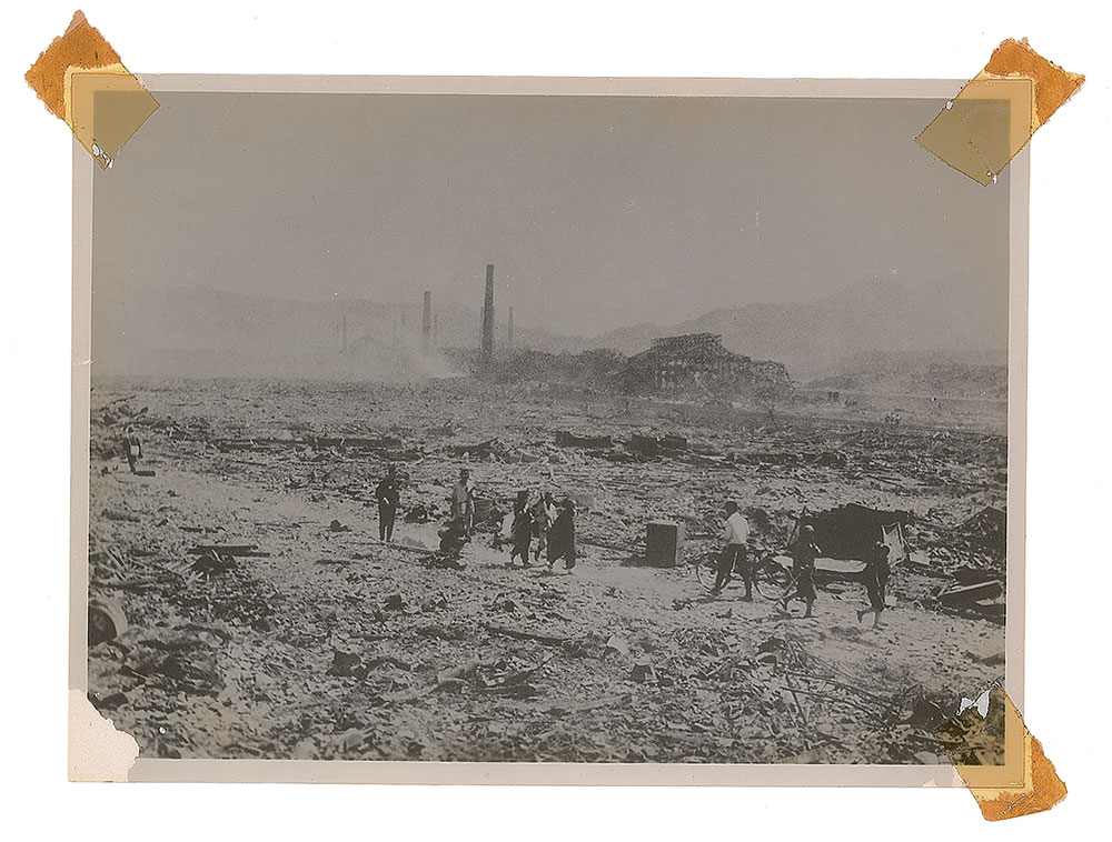 Original vintage matte-finish 5.5 x 4 photograph of people walking through the charred remains of Nagasaki with mountains in the distance, taken by Yosuke Yamahata, a Japanese military photographer, on August 10, 1945, a day after the atomic bomb was dropped on the city. In fine condition, with old tape at the corners and emulsion loss to the lower left corner.